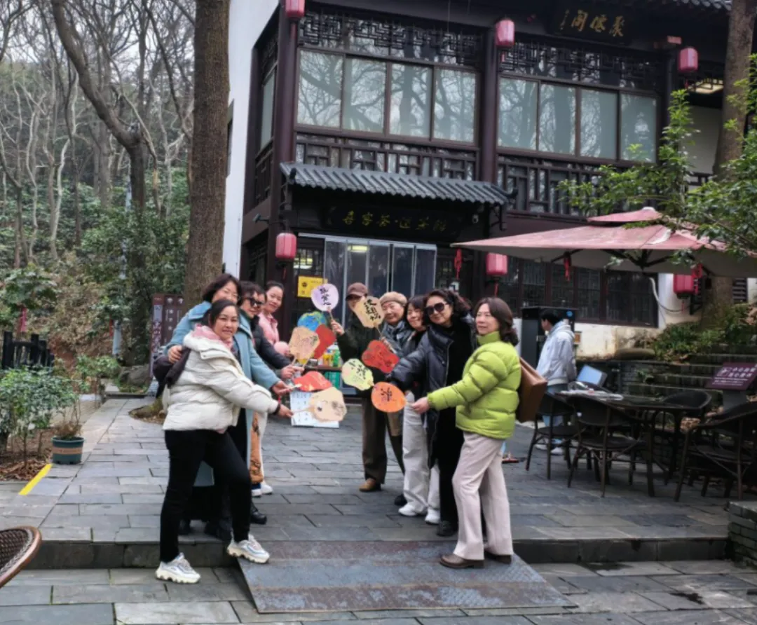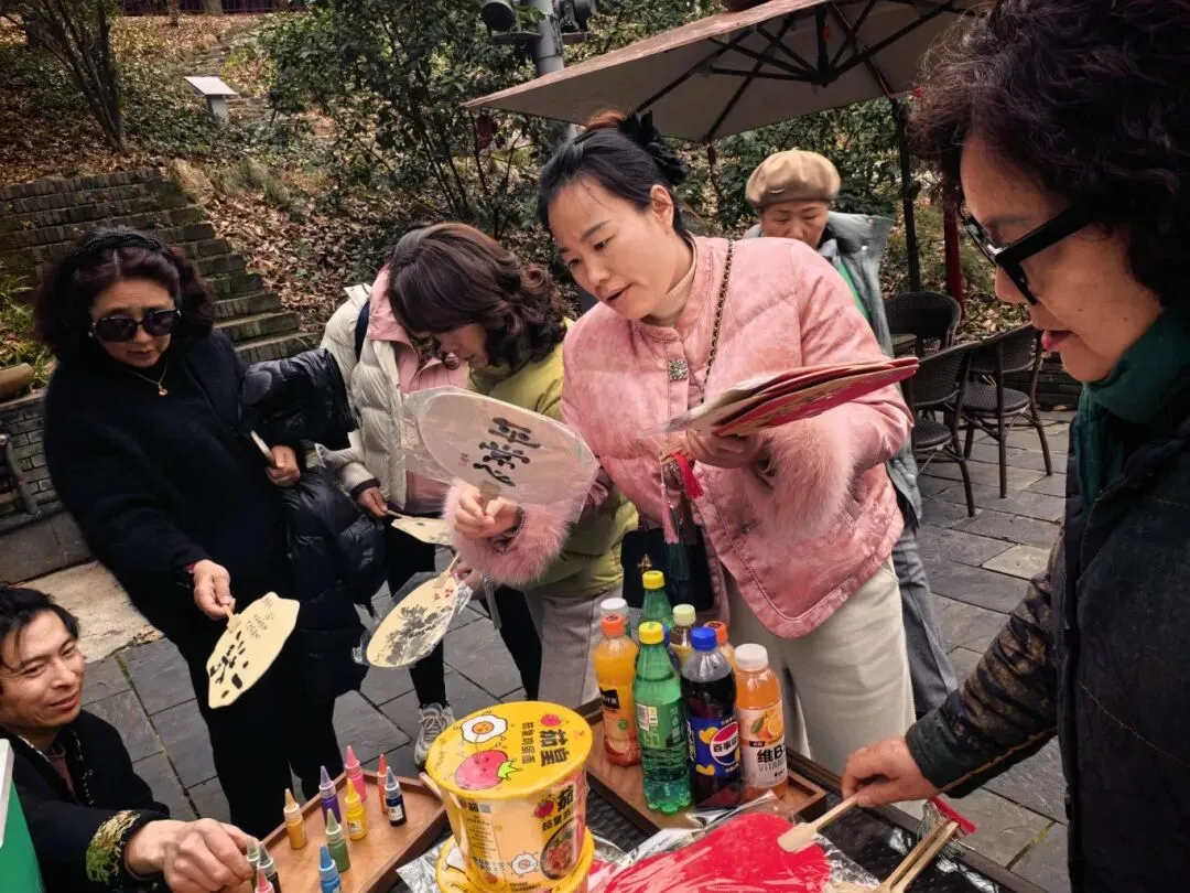 午餐过后,大家前往茅山喜客泉,体验非遗文创活动。女士们精心挑选了心仪的扇子,自带简约的基础图案与淡雅色彩,为后续创作增添了几分底色。