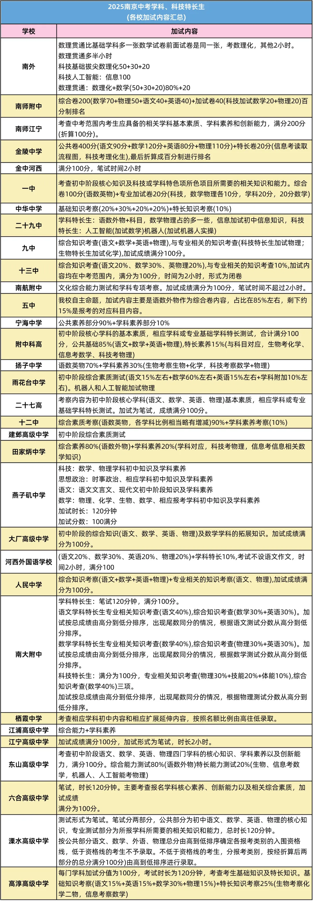 中华中学的信息科目,特长知识考查的是物理,附中科高的信息科目,特长知识考查的是数学;而中华的科技特长生考查的特长知识是数学,附中科高的科技创新项目考查的特长知识是物理。