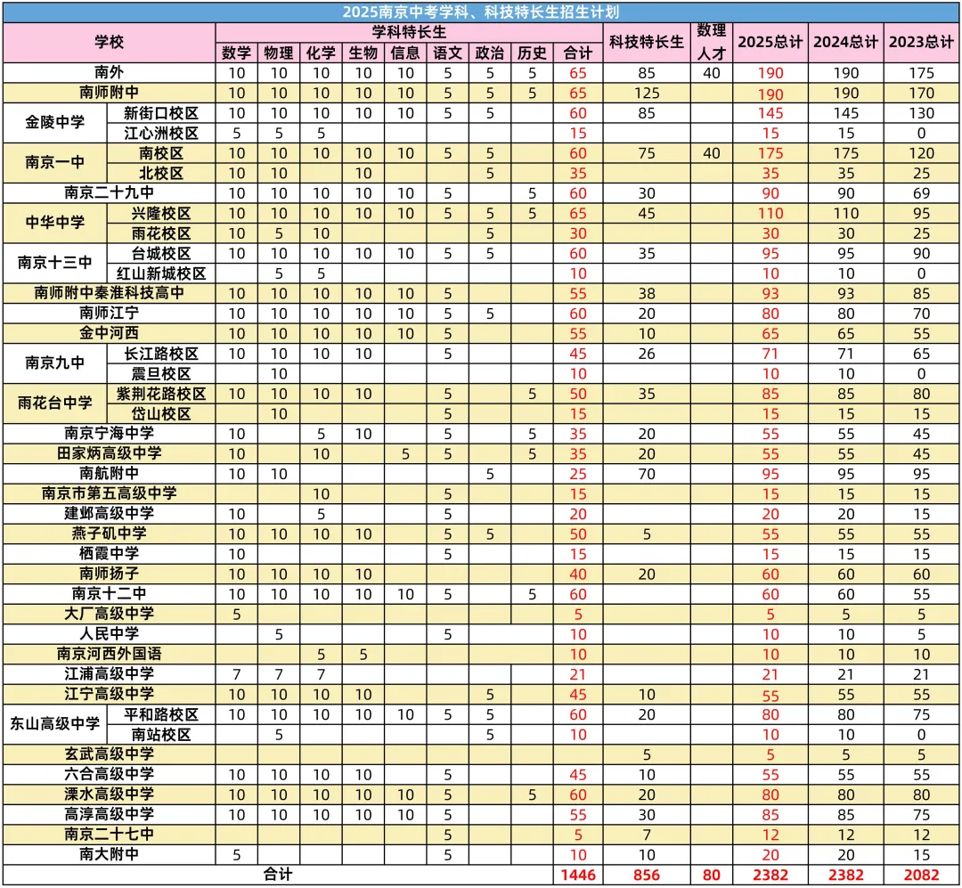 南京部分学校对特长生有一定的编班优惠,我们整理了热门高中班型及分班方式,供大家参考:2025年学科&科技特长生总计招生人数为2302人,与去年完全持平;艺术特长生招生人数总计815人,比去年增加91人;体育特长生招生人数总计446人,比去年增加73人!以上就是2026南京中考特长生考试的相信内容,希望能对大家有所帮助。方便各位家长全面了解,提前规划!