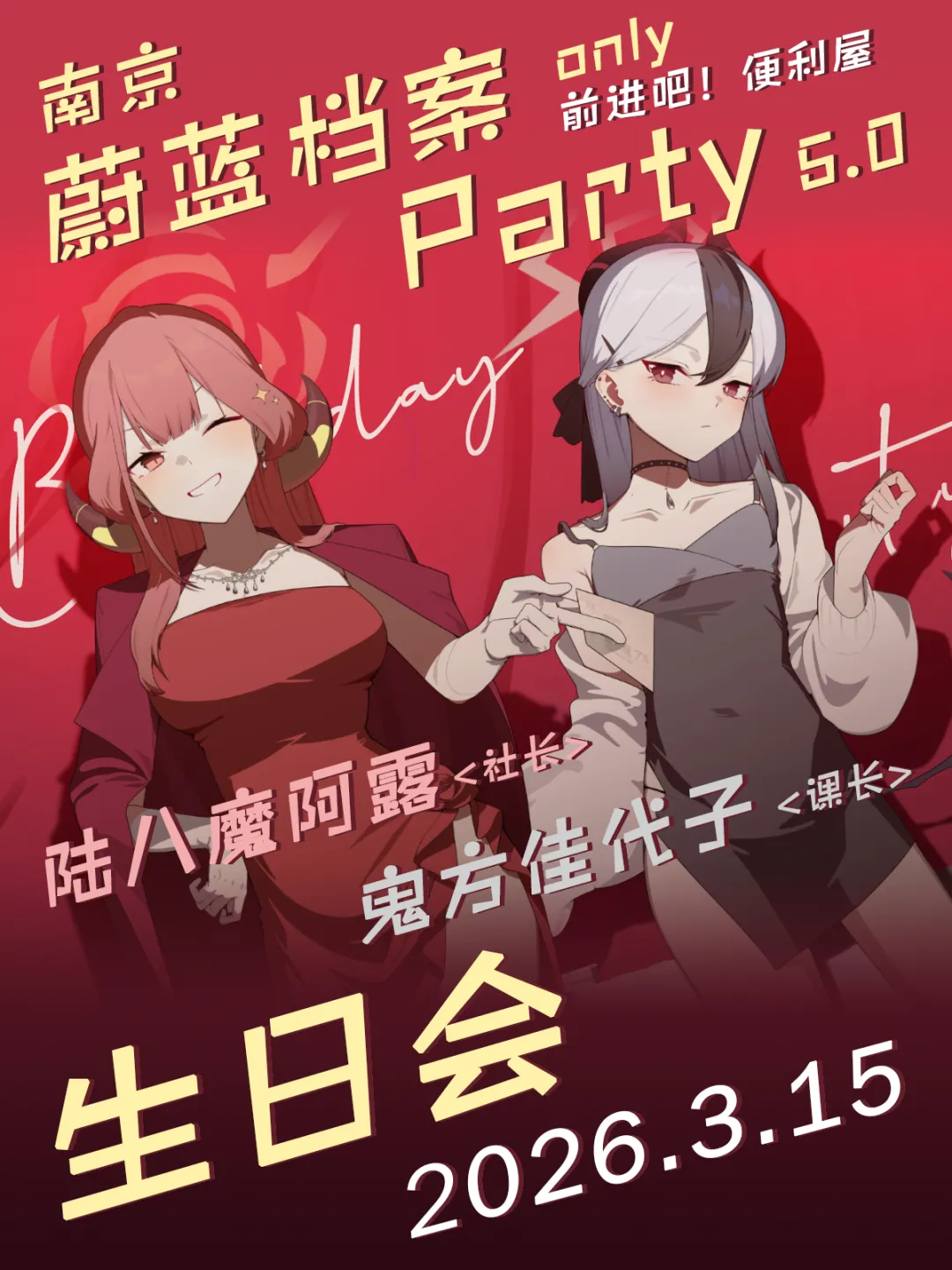 南京·蔚蓝档案同人ONLY 前进吧!便利屋Party 5.0-阿露&佳代子生日会南京·葱韵环京 VOCALOID ONLY同人展 2.0地点:do re mi轰趴派对中心(仙林大学城店)