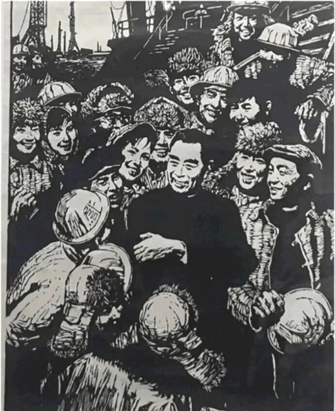 沈尧伊1978年创作的《周总理和大庆人》,是这一时期的代表作。作品以黑白木刻的强烈对比和粗犷刀法,生动刻画了周恩来总理深入大庆油田,与石油工人亲切交流的场景。画面采用中心构图,凸显领袖与群众的紧密联系,刀锋间流淌的不仅是对周总理平易近人形象的缅怀,更是对“自力更生、艰苦奋斗”大庆精神的深情礼赞。