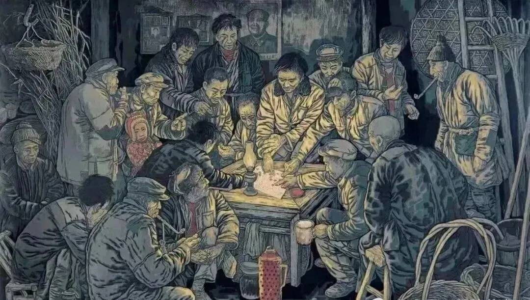 张国琳2009年创作的《生死印——1978·安徽凤阳》,堪称改革开放的艺术见证。作品以强烈的明暗对比与厚重刀法,聚焦小岗村18位农民按下“生死契约”红手印的历史性瞬间。刀锋下的红手印,不仅是农民为求生存“敢为天下先”的勇气象征,更开启了中国农村改革的序幕,兼具历史的厚重感与精神的纪念碑性。