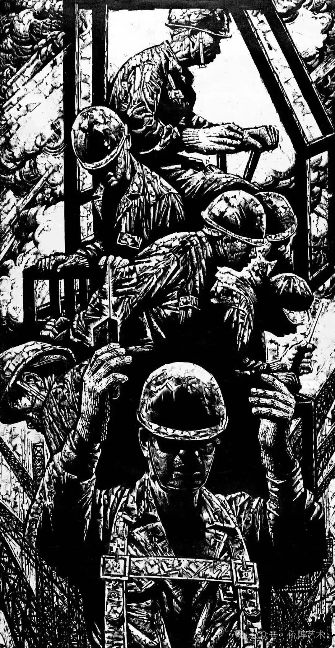 代大权2004年的《建设者》则将目光投向城市建设的热潮:作品刻画了一群头戴安全帽、动态协作的建设者群像,融合中国传统绘画的线性语言与西方空间意识,强烈的黑白对比与粗犷刀法,既强化了劳动的节奏感,更揭示了普通劳动者作为国家发展动力源泉的人性光芒。