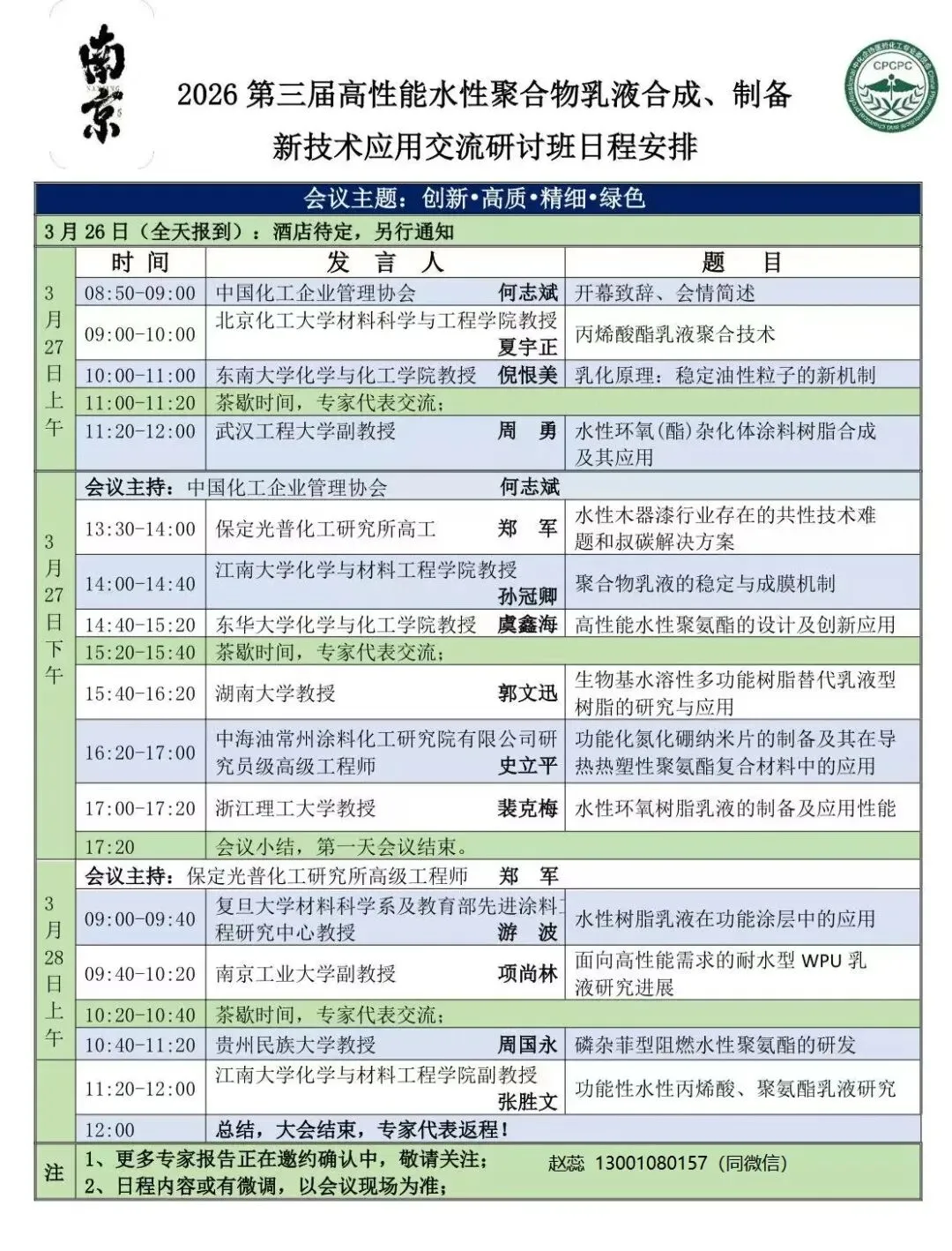 为了呈现聚合物乳液新技术以及水性乳液的最新研究成果,加强各生产企业间的交流,增进企业间的合作,本单位将于3月26日-28日在南京举办“2026第三届高性能水性聚合物乳液合成、制备新技术应用交流研讨班”。届时将邀请业内资深专家到会演讲并进行专题交流,与全行业人士携手共同促进水性技术成果转化。请各有关单位积极选派人员参加,现将有关事项通知如下: