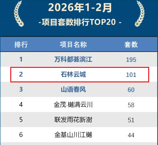 相关统计机构的数据也印证了项目的火爆,据克而瑞南京数据,在全市1-2月楼盘销售套数排行榜中,石林云城以101套的成绩杀进全市TOP10,排名全市第二。