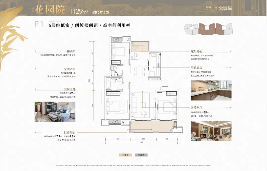 平层“公园院”:建面约129㎡4室2卫,打造约1.8米宽阳台,引景入户,可打造为一方空中小院。