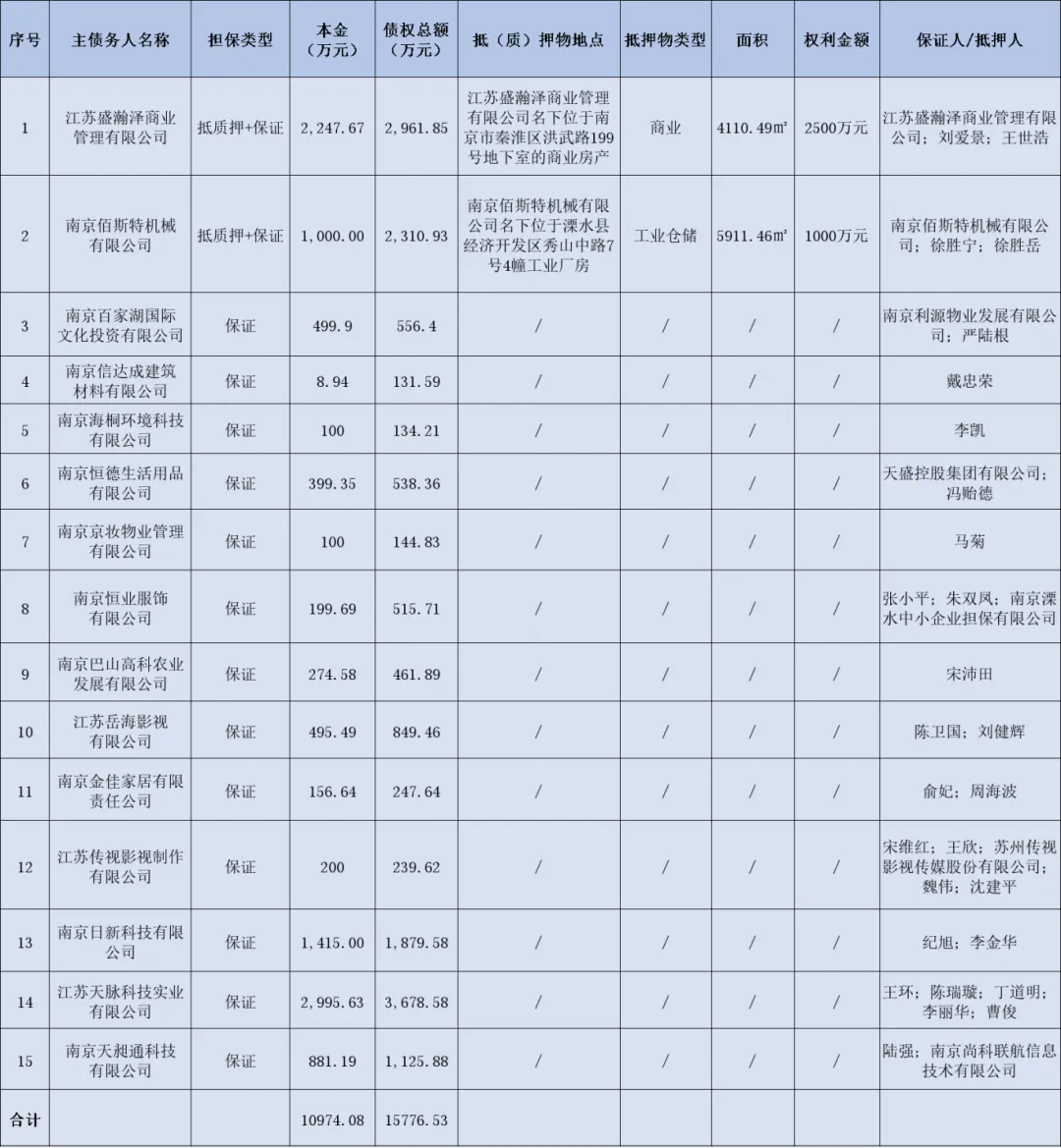 关于南京佰斯特机械有限公司等15户不良债权推介信息