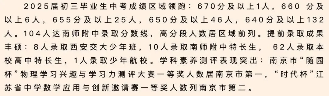 提前录取:8人录取西安交大少年班,10人录取南师附中特长生, 62人录取本校高中特长生,1人录取少年航校。
