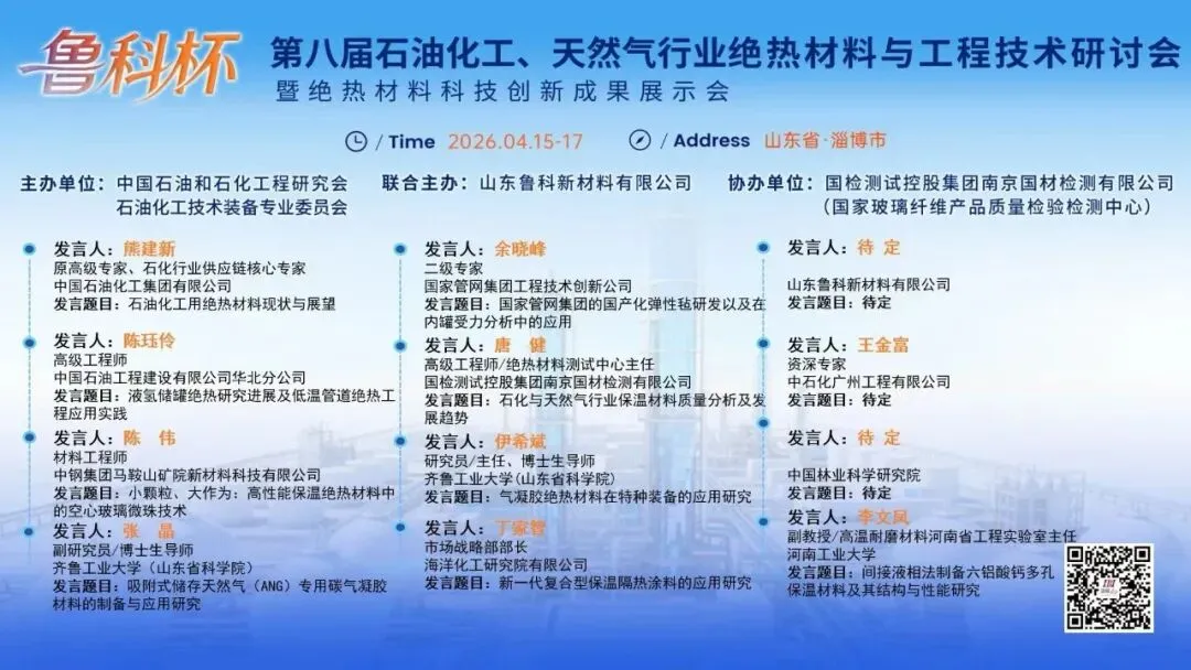 为了有效了解我国石油化工、天然气等行业绝热材料领域发展的最新动态和发展趋势,把握国内、国际政策和技术走向,搭建业主单位和企业之间沟通合作的桥梁,展示绝热材料领域的新产品、新技术、新装备及创新应用,助力企业拓展市场、促进产业协同发展,国检集团南京国材公司携手中国石油和石化工程研究会石油化工技术装备专业委员会定于2026 年4月15日-17日在山东·淄博召开“鲁科杯-第八届石油化工、天然气行业绝热材料与工程技术研讨会暨绝热材料科技创新成果展示会”。