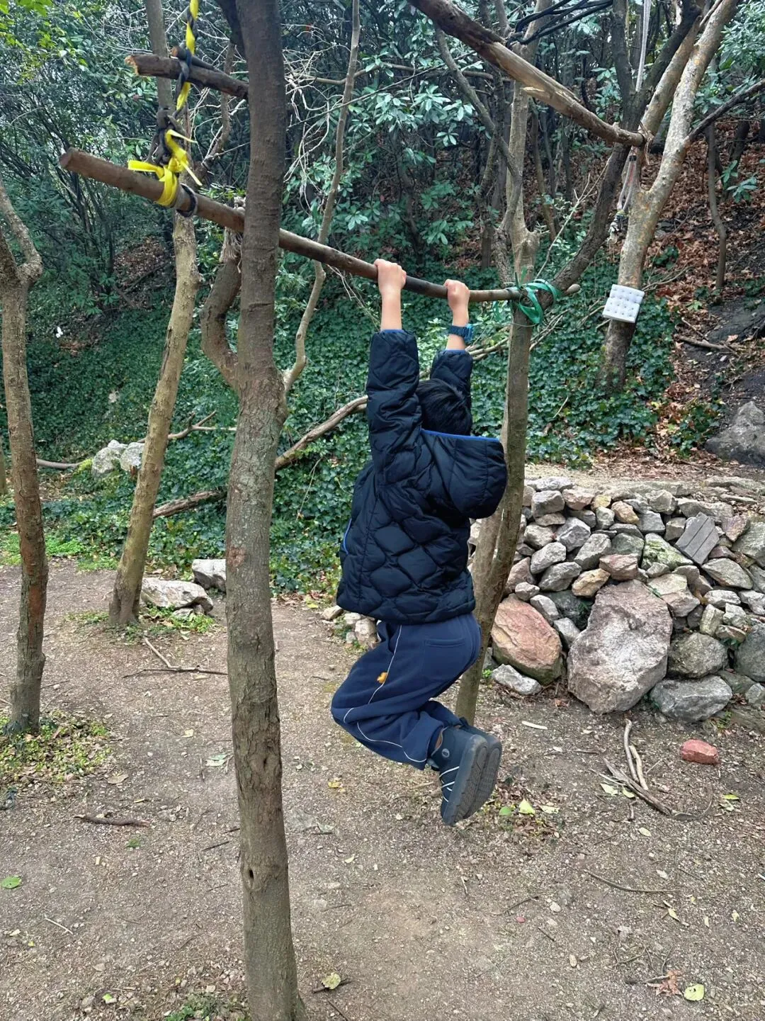 小福像发现宝藏一样,每个“器材”都要玩一遍。他吊在引体杆上晃来晃去,又去推那个大轮胎,还一本正经地坐在“休息区”的石头上。