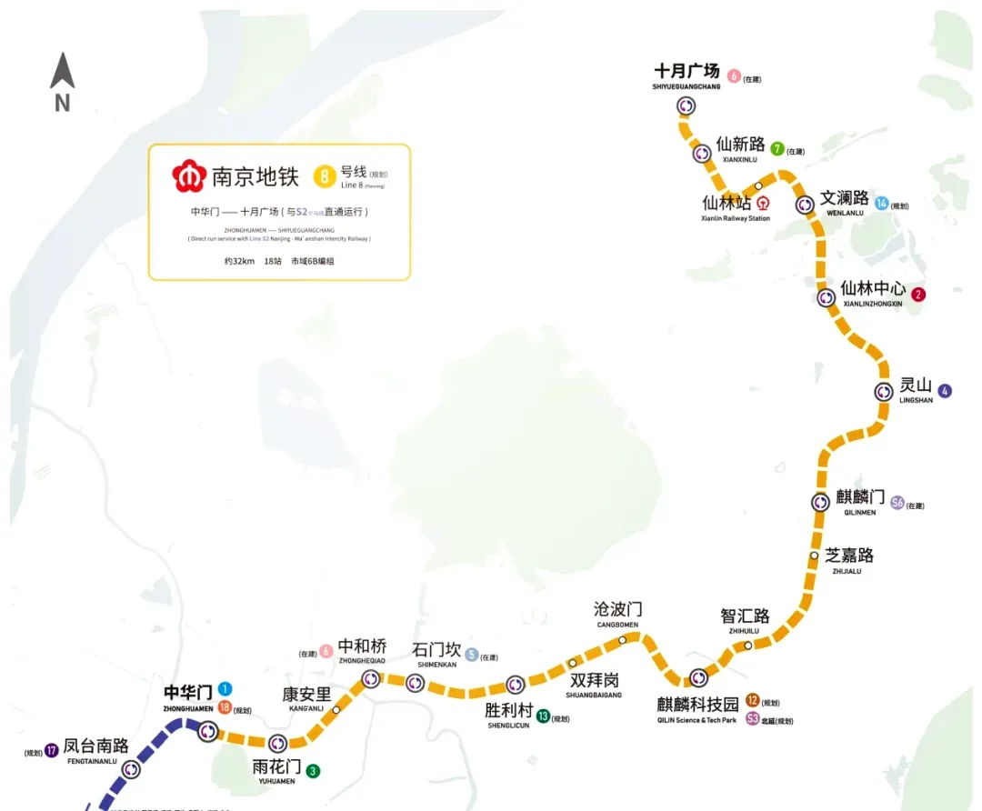 地铁8号线全线途经栖霞区、秦淮区、雨花台区和江宁区。未来全线通车的8号线,可以与多条地铁线路进行换乘。