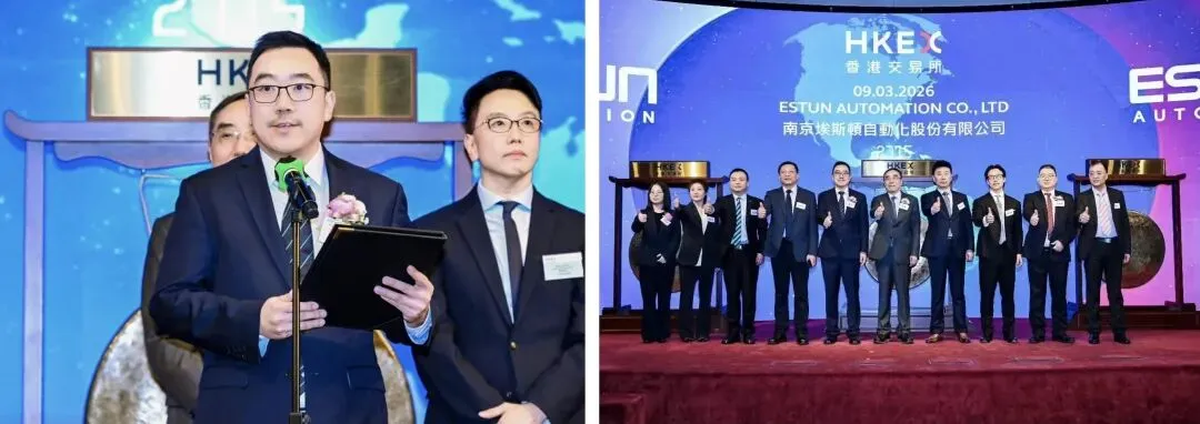 当天上午,政府领导、投资机构、中介机构及埃斯顿管理层齐聚港交所出席埃斯顿上市仪式,共同见证这一历史性时刻。9点30分,埃斯顿董事长吴波,埃斯顿总裁吴侃,与各方领导一起,共同敲响开市金锣,宣告埃斯顿正式登陆香港资本市场。
