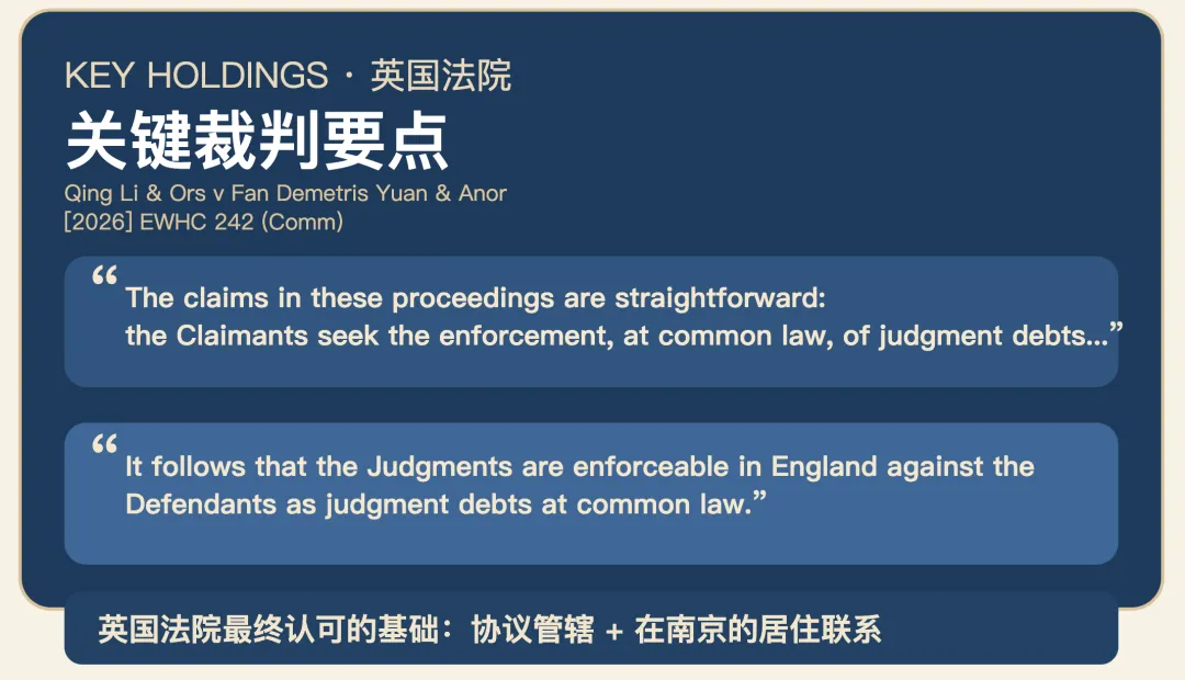 近日,英格兰及威尔士高等法院在 Qing Li & Ors v Fan Demetris Yuan & Anor [2026] EWHC 242 (Comm) 案中,承认并准许执行南京法院作出的五份生效判决。➡️南京法院5起民商事判决一并得到英国法院承认⬅️ 看到此文的第一反应,很容易让人联想到“互惠承认”(reciprocity)。但如果回到英国法院判决书本身,就会发现,这起案件真正的法律逻辑并不是“因为互惠,所以承认”,而是英国法院依其普通法上关于外国判决承认与执行的既有规则,对中国法院判决进行审查后,认定其可以在英国执行。也正因为如此,这起案件真正值得讨论的,不只是结果本身,而是中国法院判决进入普通法国家执行程序时,法院究竟在关注什么、怎么审、又为什么会予以承认和执行。 英格兰及威尔士高等法院审查的这五份南京法院判决,涉及的是被告与五名原告之间先后发生的借款和投资合作纠纷。南京市秦淮区人民法院、南京市栖霞区人民法院作出五份生效判决,判令各被告偿还本金、利息及诉讼费用,总金额超过人民币2.45亿元。 在南京法院判决生效后,原告发现被告袁某、高某夫妇已移居英国,于是转向英格兰及威尔士高等法院寻求承认与执行上述生效判决。就这样,一组原本发生在南京的民商事争议,被带入了英国普通法关于外国判决承认与执行的审查框架之中。 英国法院明确界定本案为普通法上的外国判决执行之诉。英国法院判决开篇即指出,五名申请人,请求的是将中国法院判决作为“common law judgment debts(普通法上的判决债务)”在英国执行。根据英国法院判决载明的案件背景,五名申请人在中国取得的,都是针对两名被申请人的终局性金钱判决。相关诉讼于2016年11月1日至2017年1月12日期间陆续在南京提起,相关判决书则由南京法院在2017年5月至2017年12月期间相继作出,判决内容均为明确的金钱给付,载明具体金额及相应利息及诉讼费用。 英国法院在判决说理中,并没有笼统地讨论“是否承认中国法院判决”,而是很快把焦点聚焦到一个更具体、也更技术性的问题上,即根据英国国际私法原则,中国法院是否具有作出上述判决的管辖权。围绕这一点,英国法院实际上把问题分成了两个层面。其一,是部分案件中,当事人是否已经在合同里事先接受南京法院管辖;其二,是在中国诉讼启动时,两名被申请人袁某、高某夫妇是否仍然与南京保持足够强的居住联系。这也决定了本案后续审查的重心,不在于“中国判决是不是中国法院作的”,而在于这些判决能不能通过英国普通法的管辖审查。 如果只看新闻标题,容易把这起案件理解成“英国基于互惠承认中国法院判决”。但从判决书文本与结构来看,英国法院并没有按照互惠原则处理。 英国法院判决书中反复出现的是两组措辞:一组是 “at common law(依普通法)”,另一组是 “judgment debts(判决债务)”。在引言项下第4段,法官直接写道,申请人请求的是“the enforcement, at common law, of judgment debts”(普通法中判决债务的强制执行);在 Issue(争议焦点)项下第36段,法官进一步概括了普通法下外国法院判决获得执行的基本条件:其一,外国判决须是终局且确定的判决;其二,须由英国法所认可为具有管辖权的法院作出;其三,且须是固定明确的金钱给付。 换句话说,英国法院在本案中的思路,不是先看有没有互惠,再决定是否承认与执行,而是先按英国普通法的既有规则,看这五份中国判决是否满足执行条件。 更有说服力的一点在于,判决在Disposition(裁判结论)项下也没有把理由落在“互惠”上,而是再次回到普通法。第91段、第92段的结论是:由于中国法院在本案中具有可被英国法承认的对人管辖基础,因此这些判决可以在英国执行。该案判决最后认定:“…the Judgments are enforceable in England ... as judgment debts at common law…”(“……这些判决在英格兰具有可执行性……作为普通法下的判决债务……”) 由此,本案的直接依据并非互惠本身,而是英国普通法长期形成的外国判决承认与执行规则。互惠在本案中仅具有背景性意义,但并非构成裁判结论的直接依据。 本案的关键已在英国法院判决第4段予以明确,在若干抗辩被放弃后,最终保留下来的核心问题只有一个,即中国法院是否“under principles of English private international law(根据英国国际私法原则)”对被告具有可被承认的管辖基础。 这一点十分关键。就本案而言,英国法院并不是直接接受中国法院关于自身管辖权的判断,而是依据英国普通法和英国国际私法原则,审查中国法院是否对被告具有英国法所认可的对人管辖基础。换言之,英国法院承认的不是“中国法院的管辖判断本身”,而是“中国法院的管辖基础在英国法看来是否足够成立”。 围绕对人管辖,英国法院在本案中主要审查了两条路径。正如英国法院判决引言项下第5段所说,本案争点分成两层:第一,相关中国法院是否因为当事人的事前约定而有管辖权;第二,相关中国法院是否因为被申请人在南京居住而有地域上的管辖权。 判决在Jurisdiction by agreement(协议管辖)项下第41段明确指出,如果当事人事先同意接受某外国法院的管辖,该外国法院即可被视为具有可被英国法认可的管辖基础。结合本案事实,英国法院认定本案部分合同中的争议解决条款,足以构成被告对南京法院或者有管辖权的南京法院的事前接受。英国法院并未拘泥于形式主义意义上的“严格专属管辖条