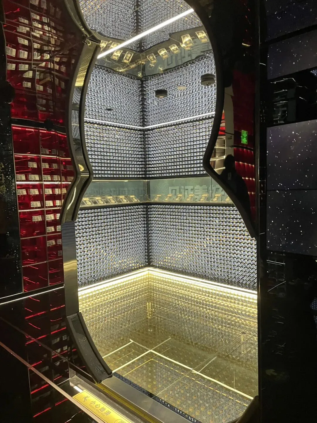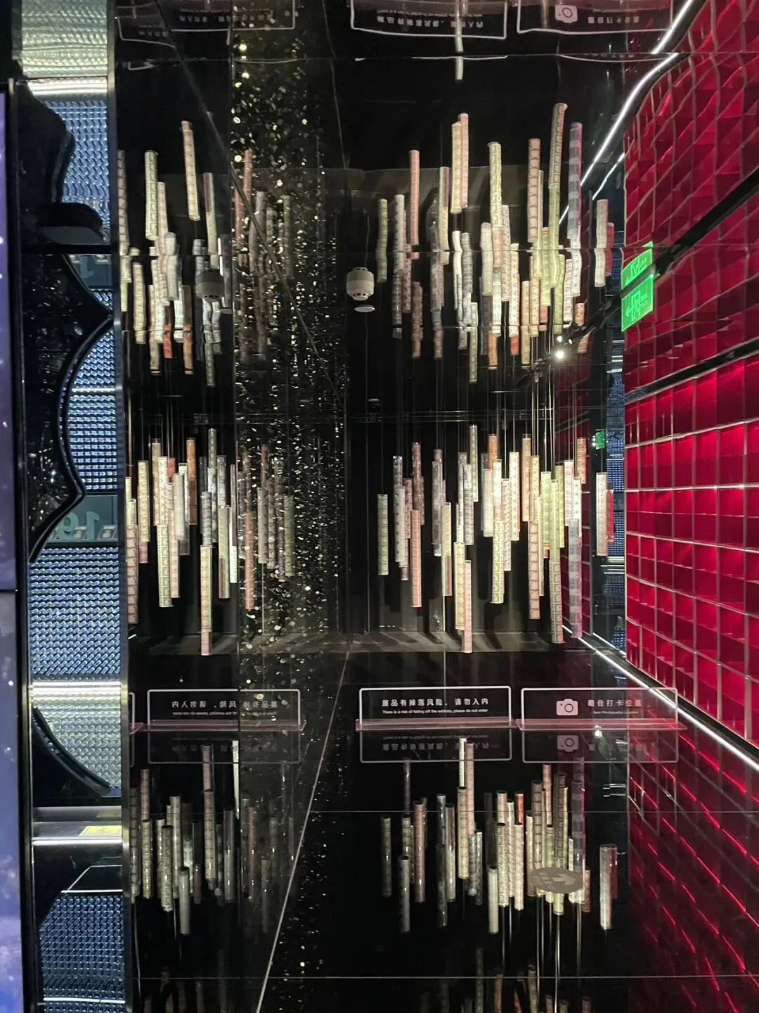 稳稳当:因为走到底,它里面只有一块屏幕上面有钱,但是有六块镜子,就能一下反射出来有很多很多钱。