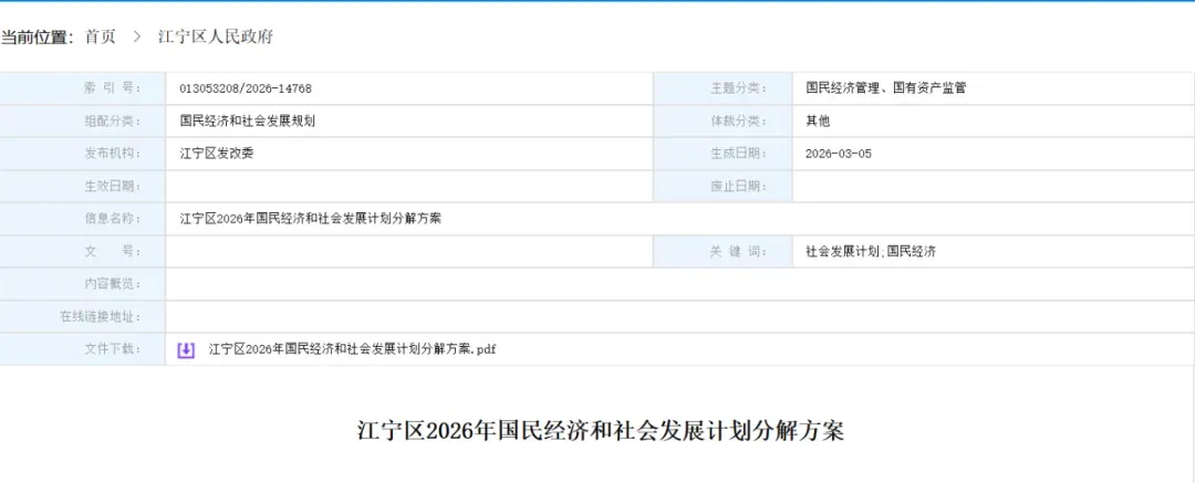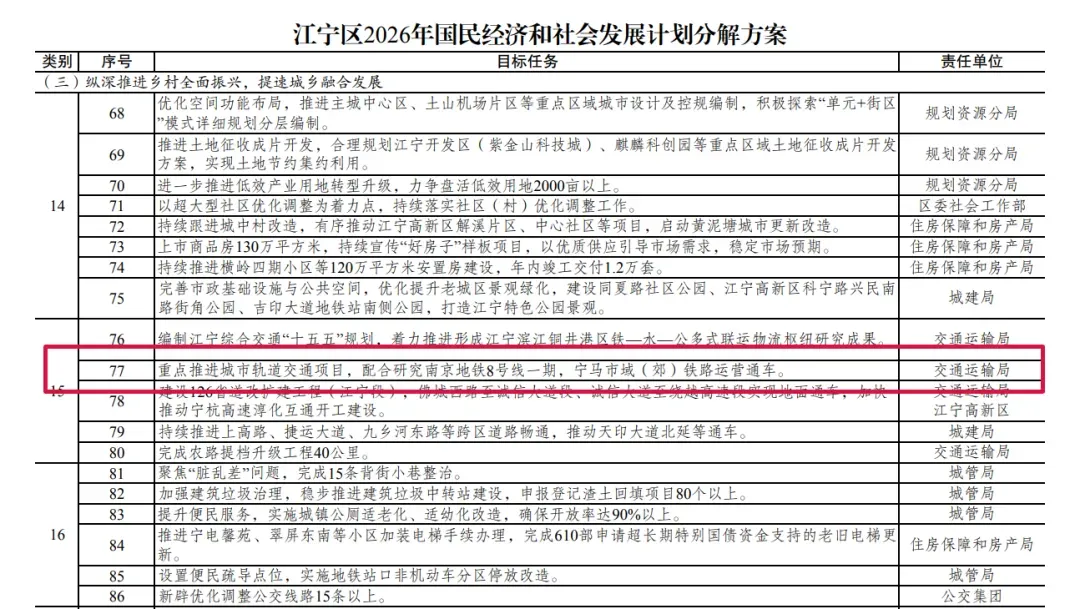 江宁区政府发布的《江宁区2026年国民经济和社会发展计划分解方案》中提到将重点推进城市轨道交通项目,配合研究南京地铁8号线一期,宁马市域(郊)铁路运营通车。