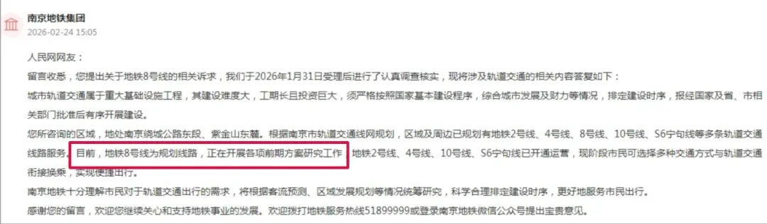 另外,南京地铁官方明确回应网友问询,确认8号线正在紧锣密鼓地开展各项前期方案研究工作。