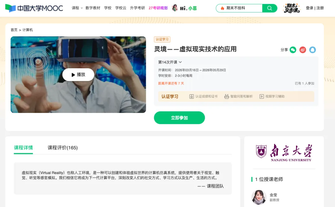 由南京大学+遥知联合打造的《灵境——虚拟现实技术的应用》将在中国大学MOOC网上线第14轮,欢迎预约学习。课程链接:https://www.icourse163.org/course/NJU-1207025801?from=searchPage&outVendor=zw_mooc_pcssjg_