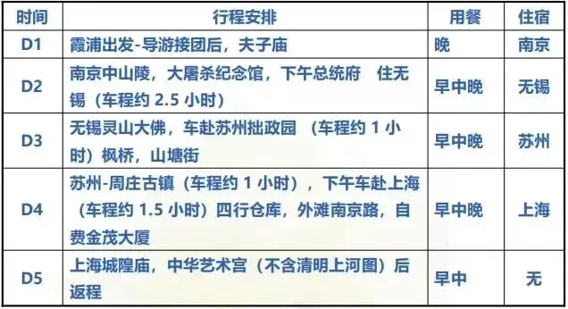 早餐后,游览:【小吃汇●城隍庙商城】(不含寺庙)庙会中最大的特色要数城隍庙小吃了,城隍庙小吃起源于明朝永历年间,这里的小吃讲究精巧细致,量不多,价不贵,正应了上海人“少吃一点,多吃几样”的风格;后游览 2010 世博会保留场馆——【中华艺术宫】(周一闭馆,原中国馆免费开放区,约 45 分钟,清明上河图自理 20 元),展馆建筑外观以“东方之冠,鼎盛中华,天下粮仓,富庶百姓”的构思主题,表达中国文化的精神与气质。中餐后,适时返程 【行程说明】 1、以上城市之间行程及景点时间为大概参考时间,行程实际出行中,在不减少景点的情况下,导游、司机可能会根据天气、道路堵车、餐厅拥挤排队等情况,对您的行程进行适当调整(如调整景点游览顺序及时间等),但不减 少景点。 2、如因不可抗因素造成无法游览,只负责退还旅行社优惠门票,不承担由此 造成的损失和责任,请游客理解并予以配合!住宿:4 晚准准三商务酒店,成人每晚一个床位,因高标酒店均不设三人间,出现单男单女报名时请补房差;