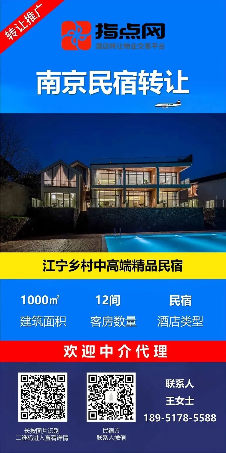 民宿位于南京江宁区乡村旅游核心地段,距南京南站、禄口机场车程30分钟,距地铁站车程10余分钟,距机场高速、宁马高速、绕越高速车程均在15分钟左右,交通便利。 民宿距牛首山景区车程20多分钟,银杏湖乐园及高尔夫球场1公里,周边景点环绕。民宿所在的村落为南京网红知名景点,配套齐全,有多家咖啡馆、餐厅、烧烤场、儿童乐园、牧场,无门票及停车费,周末、节假日客流稳定。村子不定期有各种引流活动,有物业管理,整洁舒适。 民宿建筑面积约1000平方米,12 间客房,面积38-66平方米,有咖啡厅、披萨窑炉及户外用餐区、会议室、休息室(台球室)、屋顶大露台、泳池、泡池、草坪、花园、池塘(可垂钓)、菜地等公共配套。设计时尚,高标准配置各类用品,包括地暖、中央空调、空气能热水系统、软水机等。民宿自带两个停车位,此外村子有多个公共停车场,停车便利。 民宿2019年5月开业,多年来不断更新设施及景观改造,维护较好。已累计投资1200多万元,现诚意转让。转让费面议,欢迎有实力有诚意人士联络,欢迎中介。