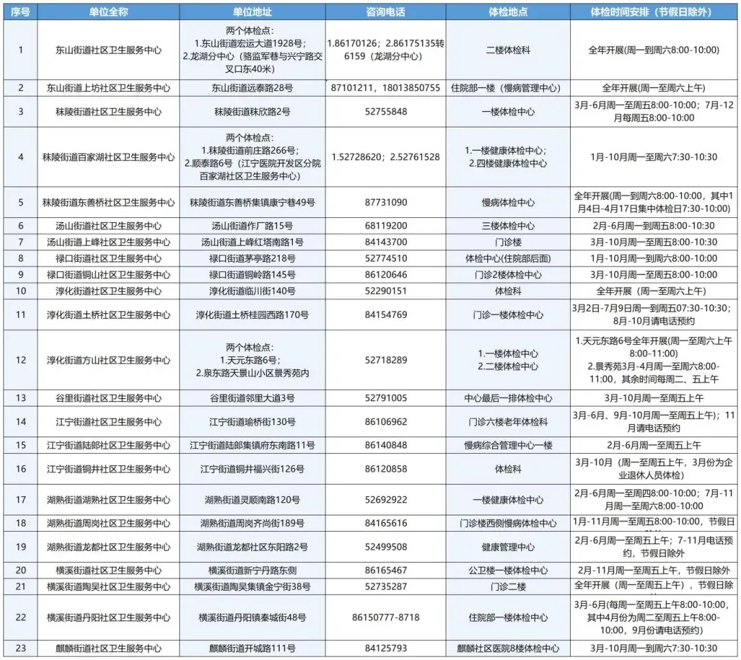 1.顶山街道社区卫生服务中心体检中心(江北新区丁家圩埂路12号南苑邻里中心C栋三楼)