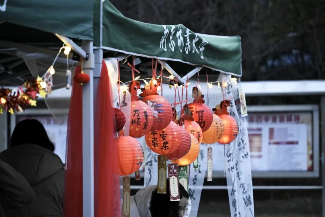 不远处,“上元祈福,福满今宵”祈福区的花灯架上,五彩祈愿卡随风轻曳,字里行间写满青春期许与佳节愿景,成为校园中最动人的风景。