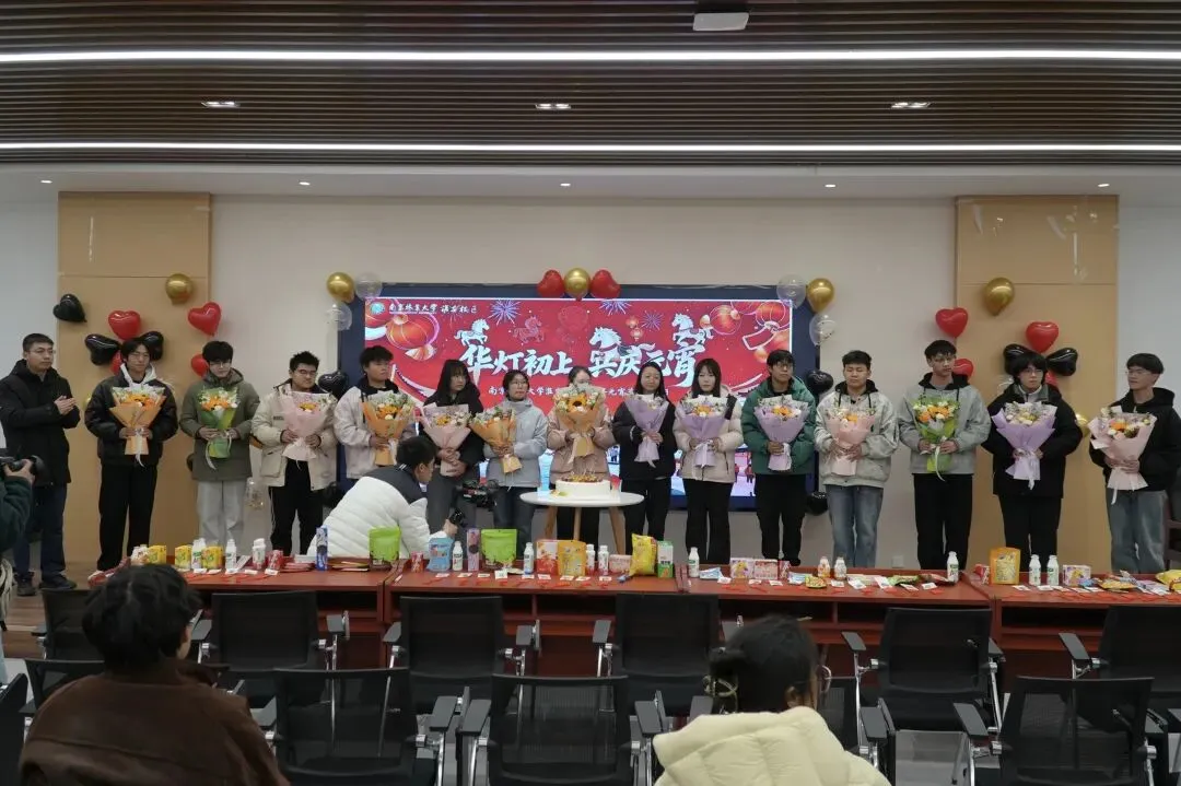 生日蛋糕缓缓推出,烛光映照着一张张青春面庞。熟悉的旋律响起,现场师生共同见证这份专属祝福。校区领导、辅导员与宿管老师亲临陪伴,与学子围坐共话。大屏幕上播放着精心制作的祝福视频,许多同学感动落泪。“这是我第一次在学校过集体生日,也是最难忘的一次。南林就是我们的第二个家。”一位寿星动情地说。