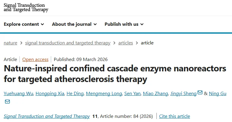 动脉粥样硬化是心血管疾病的主要病理基础,其发生发展与氧化应激和过度炎症反应密切相关。然而,现有的抗氧化和抗炎疗法在临床转化中面临诸多瓶颈。近日,南京大学顾宁院士、东南大学盛静逸教授团队一项发表于国际知名期刊《Signal Transduction and Targeted Therapy》的最新研究:研究团队开发了一种受自然界多酶复合体启发的级联纳米反应器,该平台能精准靶向动脉粥样硬化斑块,高效清除活性氧并调节炎症微环境,在动物模型中展现出卓越的治疗潜力,为这一慢性炎症性疾病的精准诊疗带来了新希望。