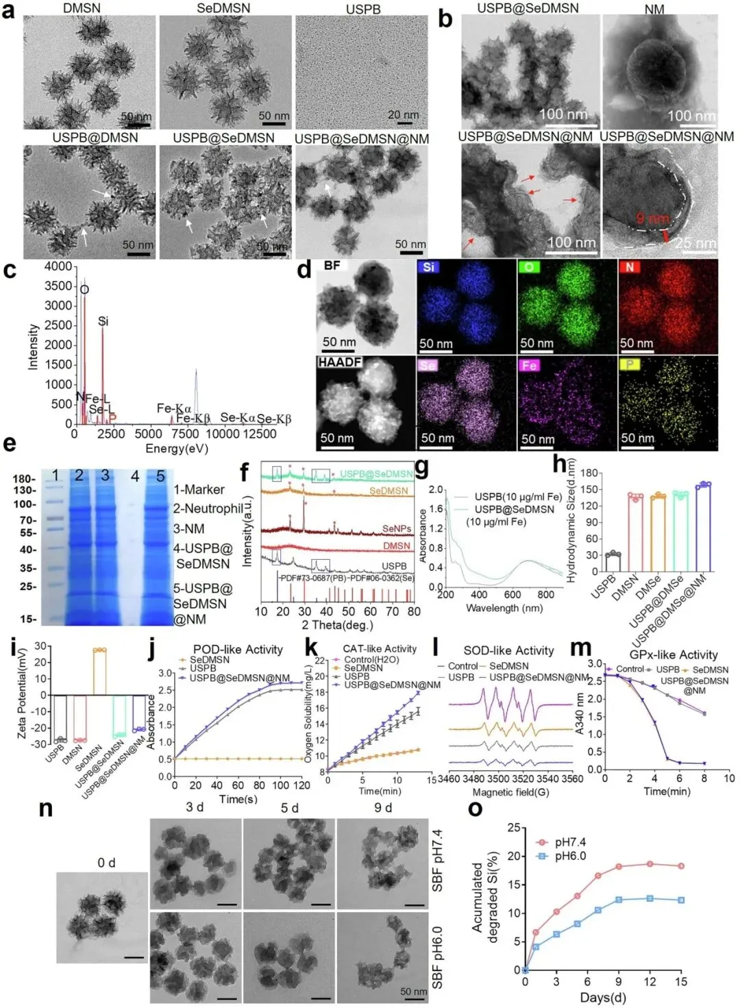 催化核心: 将具有超氧化物歧化酶(SOD)和过氧化氢酶(CAT)活性的超小普鲁士蓝纳米颗粒(USPB),与具有谷胱甘肽过氧化物酶(GPx)活性的硒(Se)共同装载于DMSN的孔道中。这种设计模拟了天然多酶复合体(MECs)中多种酶紧密协作的方式,在纳米尺度的受限空间内,实现了对超氧阴离子、过氧化氢、羟基自由基等多种活性氧(ROS)的高效、顺序清除,显著提升了整体催化效率。
