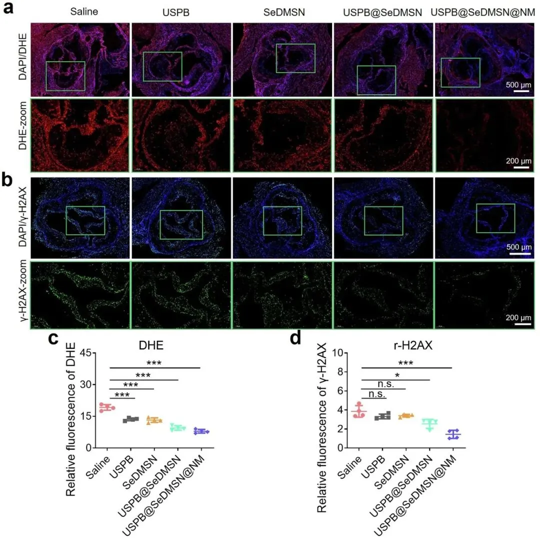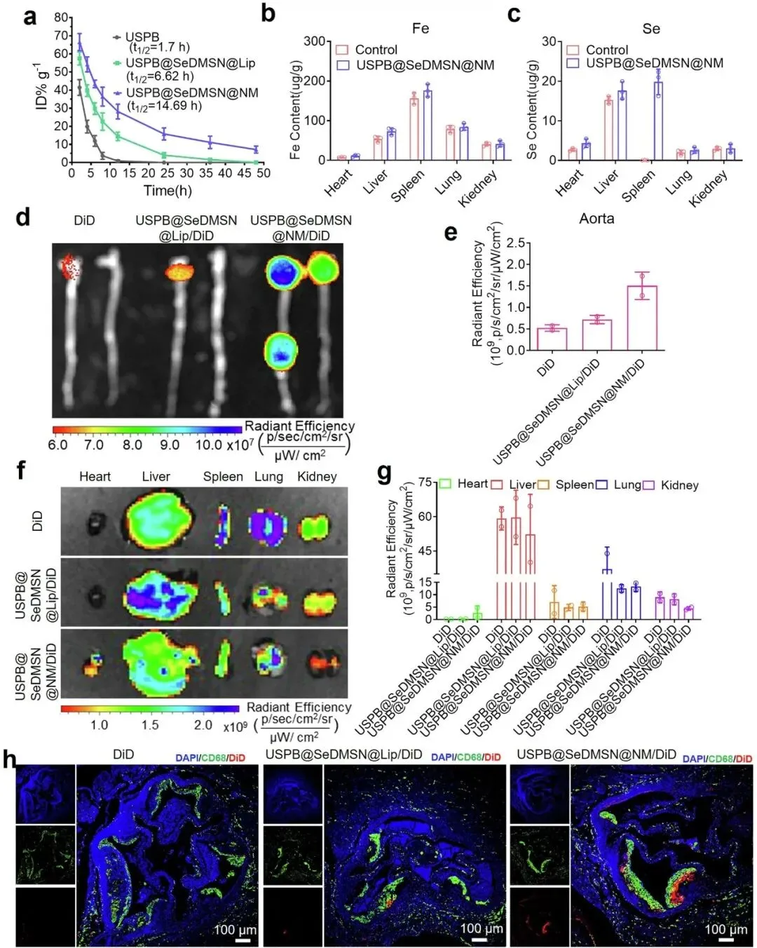 长循环与靶向蓄积: 中性粒细胞膜涂层赋予了其“隐身”功能,使其血液循环半衰期延长至14.69小时,远超未包裹的纳米颗粒。体内成像显示,USPB@SeDMSN@NM能主动靶向并在主动脉斑块部位特异性蓄积。