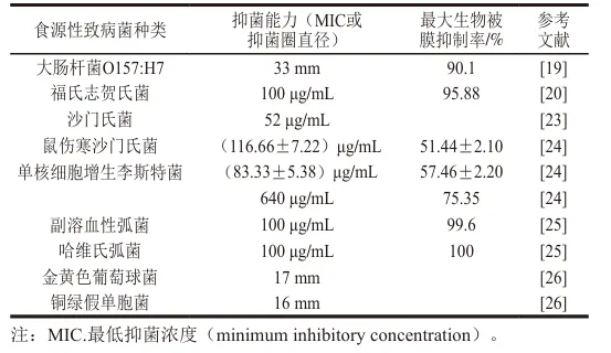 大多数大肠杆菌是非致病性的,但部分大肠杆菌如产志贺毒素的大肠杆菌,一旦被感染就可能出现腹部绞痛、(血性)腹泻、呕吐或者高烧,更严重者可能会危及生命。现今市面上常见的化学杀菌剂如柠檬酸钠、次氯酸钠、亚硝酸钠对已经具有强抵抗力的大肠杆菌杀灭效果并不理想,但众多研究结果表明,肉桂醛在低质量浓度时(240 μg/L~780 μg/L)就对大肠杆菌表现出良好的杀灭作用。Jauro等分别使用柠檬酸钠、亚硝酸钠和肉桂醛对E. coli O157:H7进行抗微生物药物敏感性试验。结果表明,相较于亚硝酸钠(26 mm)和柠檬酸钠(13 mm),肉桂醛的抑菌效果最好,抑菌圈直径最大能达33 mm。除药物敏感性试验之外,他们还分别在10、37 ℃条件下进行168 h的生物被膜形成实验,结果表明,肉桂醛对大肠杆菌生物被膜抑制效果最强,生物膜抑制率最高可达90.1%。该研究的主要目的是将肉桂醛的杀菌效果与市面上常见的消毒剂进行对比,但并未测试其在食品中的抗菌能力,缺乏一定实际应用价值。Zhan Xiangjun等则研究了肉桂醛对浮游福氏志贺氏菌及其形成生物被膜的影响,并进一步探究肉桂醛在鲜莴笋汁中的抗菌效果。结果表明,与未处理对照组相比,肉桂醛处理后的细菌表现出较长的滞后期。数据显示,肉桂醛能有效灭活LB肉汤和鲜莴笋汁中的福氏志贺氏菌。结晶紫染色结果表明,经肉桂醛处理24 h后福氏志贺氏菌生物被膜生物量显著降低。光学显微镜和场发射扫描电子显微镜(FESEM)观察结果则进一步表明,经肉桂醛处理后生物被膜成膜能力减弱,生物被膜结构被破坏。肉桂醛对常见食源性致病菌及其生物被膜的抑制作用如表1所示。
