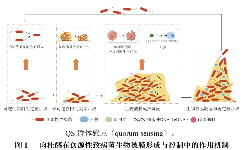 因此,肉桂醛能够抑制食源性致病菌的菌毛、鞭毛等运动器官或EPS的产生,有效阻止细菌在接触表面的黏附,进而抑制生物被膜的形成。