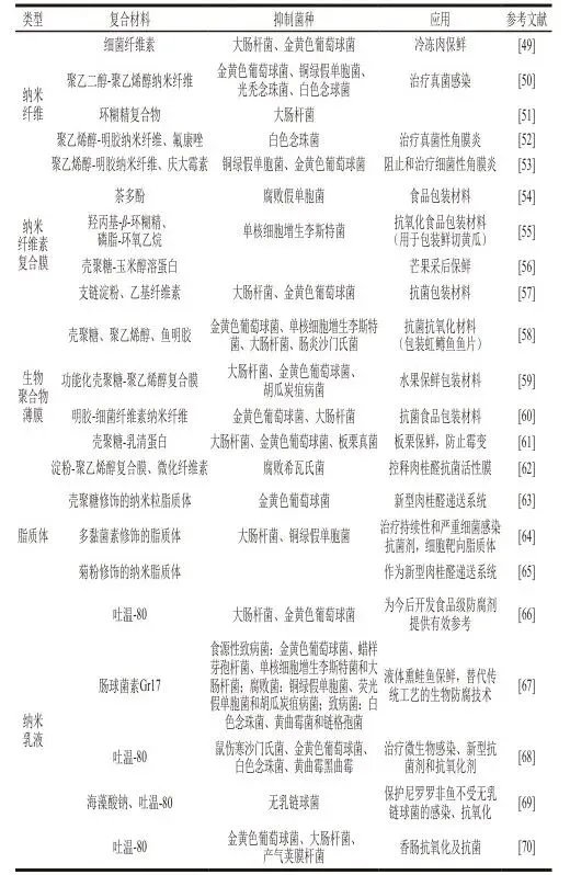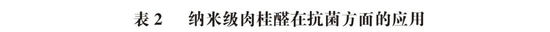 肉桂醛精油本身能在抑制细菌方面发挥显著作用,但其水溶性低、对光和热等环境因素敏感、易挥发、气味刺激性强等问题,限制了其在食品行业的应用。采用天然无毒的生物材料将其进行封装制成纳米颗粒、纳米纤维、生物聚合物薄膜、脂质体等纳米级别物质能有效解决肉桂醛自身性质的局限性,增强其稳定性和生物利用率,降低挥发性。除此之外,封装肉桂醛具有可控和持续释放的效果,能够显著延长抗菌作用时间。因此,为了高效发挥肉桂醛在抑菌方面的优良作用,将其进行纳米级别的处理是十分必要的。纳米级肉桂醛在抗菌方面的应用如表2所示。