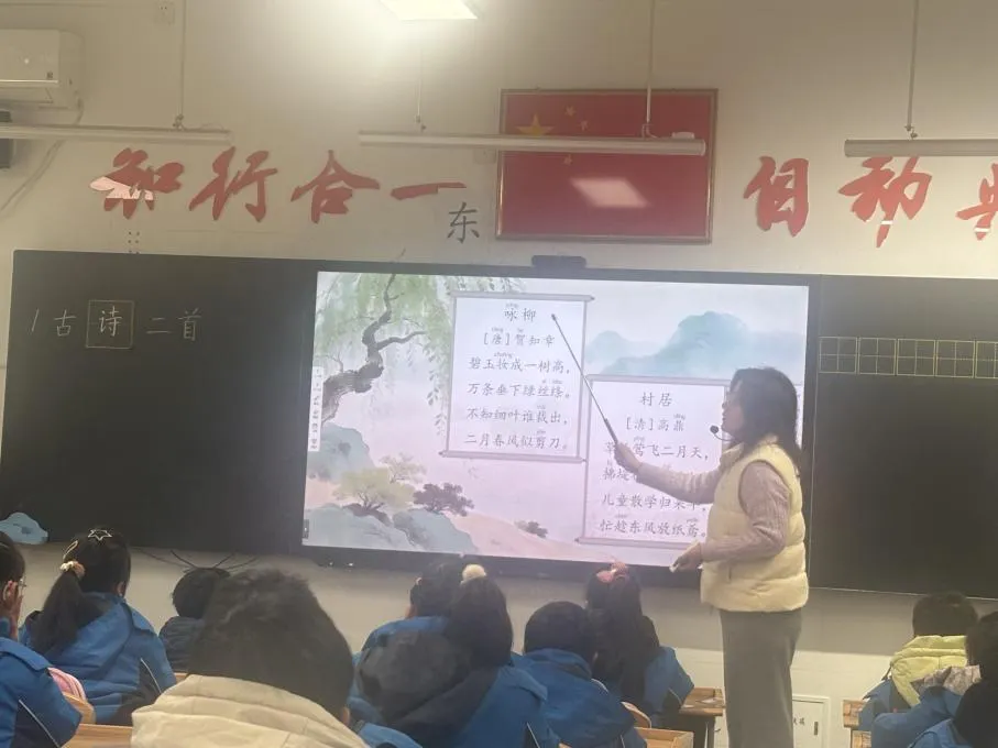 陈庆钰老师执教《古诗二首》。走进二(4)班陈庆钰老师的班级,班级常规总体较好,大部分孩子完全进入学习状态。陈老师主要教学了《咏柳》这首诗,陈老师按照“五读法”教学这首古诗,即一读读准音,二读有节奏,三读解诗意,四读明诗情,五读有感情,目标明晰,层次清楚,引导学生步步深入,最后达到有感情背诵。