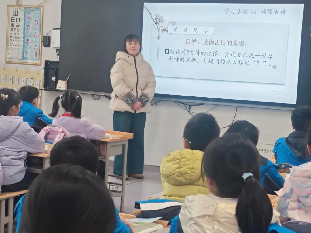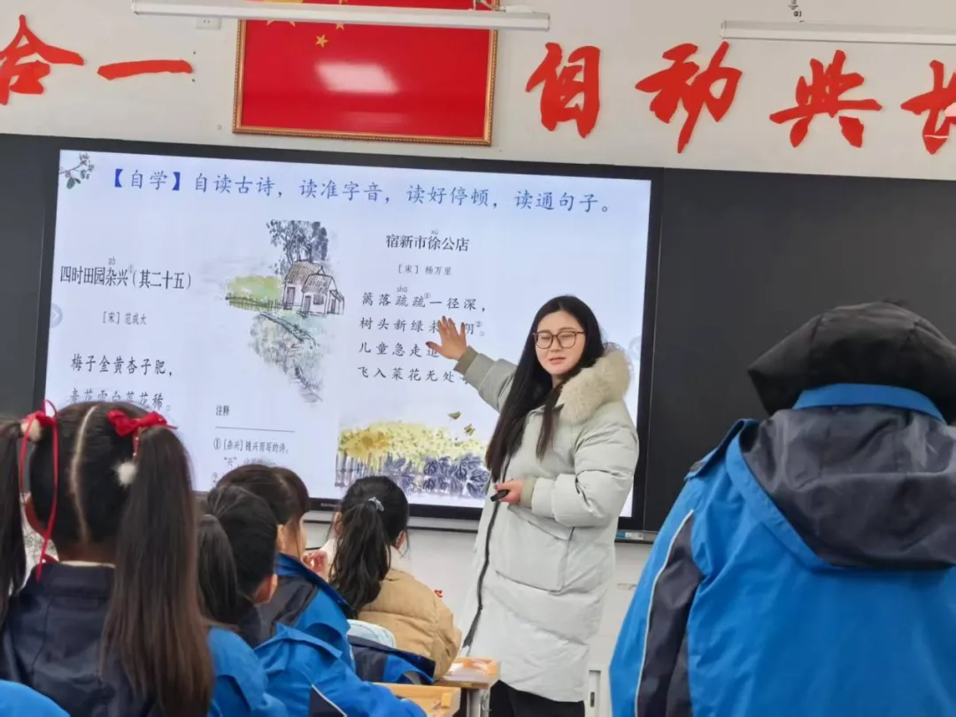 肖圆圆老师执教《古诗三首》。本节课教学目标明确,重难点定位准确,教学设计条理清晰,课堂环节衔接自然,整体教学流程规范有序。本节课目标聚焦,层次清晰,紧扣“体会诗人思想感情”这一核心目标,通过“谈话导入—初读感知—精读品析—情感升华”四个环节层层推进,引导学生逐步深入理解诗意。肖老师注重学法迁移,以生为本,先以《四时田园杂兴》示范抓景物特点体会情感的方法,再引导小组合作学习《宿新市徐公店》,体现了由扶到放的教学智慧。