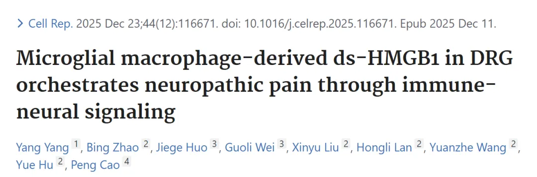 化疗诱导的周围神经病变(CIPN)是奥沙利铂等化疗药的常见副作用,以痛觉超敏、麻木为主要表现,严重影响患者生活质量甚至导致化疗中断。背根神经节(DRG)作为外周感觉中继站,是 CIPN 的关键靶点,其神经免疫微环境的交互作用参与痛觉发生,但具体机制尚未明确。高迁移率族蛋白 1(HMGB1)的双硫键亚型(ds-HMGB1)是促炎活性亚型,可激活 TLR4 介导神经炎症,但 DRG 中 ds-HMGB1 的细胞来源、氧化生成及释放机制,以及其与感觉神经元的作用靶点仍不清楚。目前 CIPN 治疗手段有限,阿片类药物疗效一般且副作用大,亟需挖掘非阿片类、不影响化疗效果的治疗靶点,同时寻找可预测 CIPN 严重程度的生物标志物。