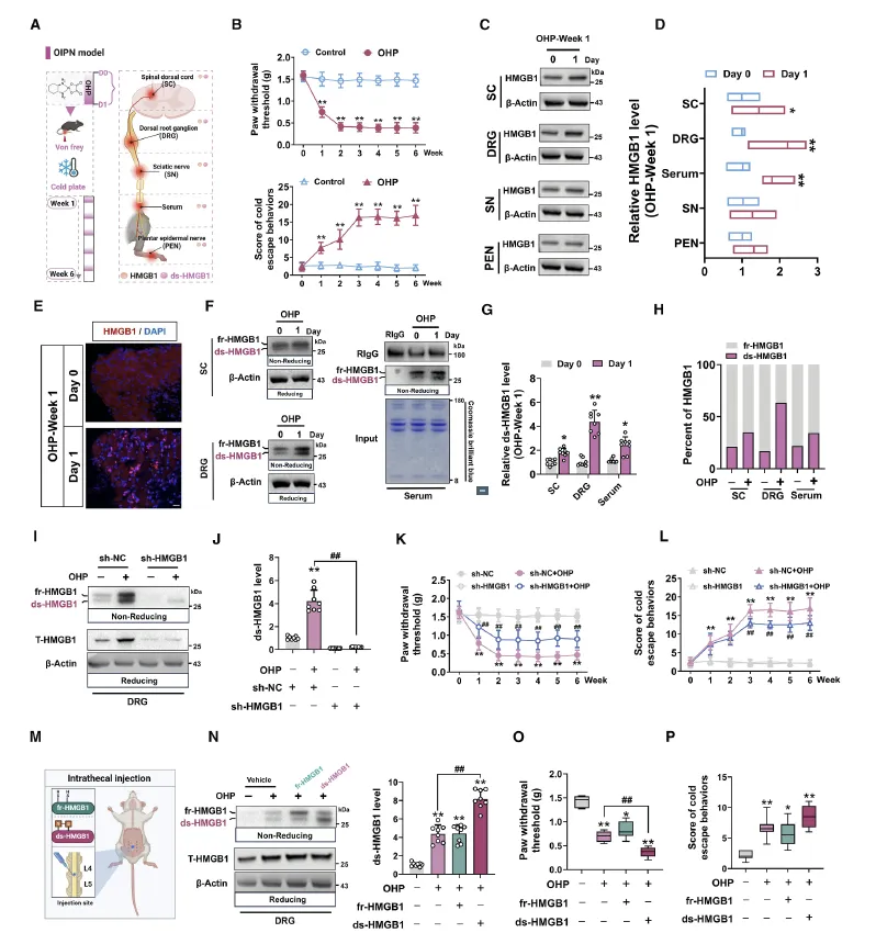 Figure 1:该图以奥沙利铂诱导的周围神经病变(OIPN)小鼠模型为研究对象,系统验证了背根神经节(DRG)中双硫键型高迁移率族蛋白 1(ds-HMGB1)是介导 OIPN 机械痛敏化的关键分子。首先通过行为学实验证实奥沙利铂处理后小鼠出现显著的机械痛和冷痛敏化,且 DRG 中总 HMGB1 及 ds-HMGB1 的升高程度远高于脊髓、血清等其他组织,ds-HMGB1 在 HMGB1 中的占比也在 DRG 中最高。通过 DRG 靶向 AAV 敲低 HMGB1,可显著降低 DRG 内 ds-HMGB1 水平并缓解机械痛敏化,而对冷痛的改善仅局限于急性期;向 DRG 鞘内注射纯化的 ds-HMGB1 会加重机械痛敏化,注射还原型 HMGB1 则无此效果,进一步证实 DRG 局部的 ds-HMGB1 是驱动 OIPN 急性机械痛的核心因子。