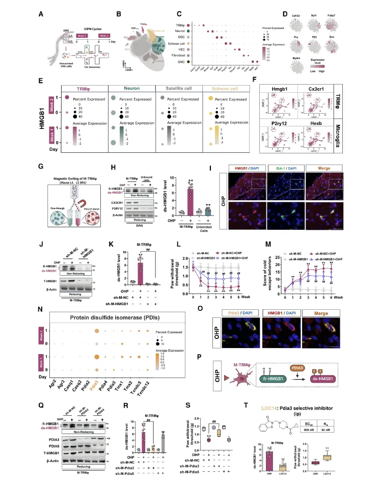 构建小鼠 OIPN 模型,通过行为学实验检测机械痛和冷痛敏化程度;利用蛋白质印迹、免疫荧光定位 DRG 中 HMGB1 及亚型的表达与细胞分布;采用单细胞 RNA 测序解析 DRG 细胞类型及基因表达特征,定位 ds-HMGB1 来源和关键调控分子;通过磁珠分选分离 DRG M-TRMφs 和神经元,验证细胞特异性的分子表达;利用 AAV 靶向敲低技术实现 M-TRMφs 或神经元中目标基因的特异性沉默,结合 PDIA3、GSDMD、TLR4 等靶点的特异性抑制剂,验证通路干预效果;构建荷瘤小鼠模型,验证干预手段对奥沙利铂抗肿瘤效果的影响;收集结直肠癌奥沙利铂化疗患者血清,检测 ds-HMGB1 水平并分析其与 NCI-CTCAE 疼痛分级、VAS 评分的相关性,同时结合 ELISA、免疫印迹等技术检测炎症因子水平。