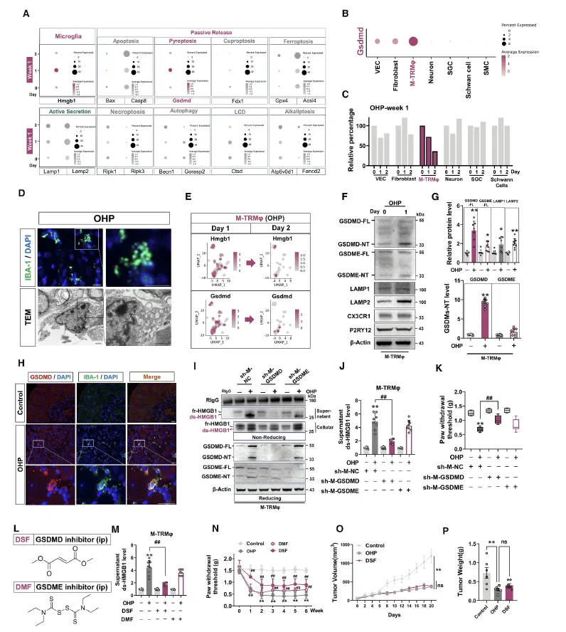 Figure 3:该图阐明了 DRG 中 M-TRMφs 释放 ds-HMGB1 的核心方式为 GSDMD 介导的焦亡,且抑制该过程可缓解疼痛同时不影响奥沙利铂的抗肿瘤效果。通过单细胞测序分析 M-TRMφs 中 HMGB1 的释放通路,发现奥沙利铂处理后焦亡相关分子 GSDMD 显著上调,而溶酶体介导的分泌通路无明显变化,且 M-TRMφs 的数量随奥沙利铂处理减少,符合焦亡的细胞特征。免疫荧光和电镜实验证实 M-TRMφs 在 OIPN 中出现焦亡的典型形态学改变,GSDMD 及其活化的 N 端片段在该细胞中高表达。特异性敲低 M-TRMφs 中的 GSDMD 可显著减少 ds-HMGB1 的胞外释放并缓解机械痛敏化,而敲低另一焦亡分子 GSDME 则效果微弱;GSDMD 的特异性抑制剂双硫仑可有效降低 ds-HMGB1 释放并改善疼痛,且在荷瘤小鼠模型中,双硫仑与奥沙利铂联用不会削弱奥沙利铂对肿瘤的抑制作用,证实该干预靶点的临床应用安全性。