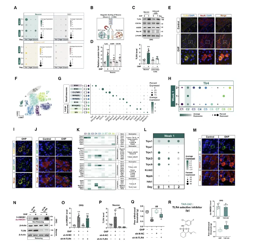 Figure 4:该图解析了 ds-HMGB1 引发痛觉敏化的下游作用机制,即通过结合 DRG 中 C2 亚型感觉神经元的 TLR4,激活 NF-κB 通路并上调 TRPV1,进而放大疼痛信号。通过单细胞测序、磁珠分选和免疫荧光实验发现,奥沙利铂处理后 DRG 神经元中 TLR4 表达显著升高,且 TLR4 特异性富集在 C2 亚型感觉神经元上,其他 HMGB1 受体则无明显变化。ds-HMGB1 与 C2 神经元的 TLR4 结合后,会触发 NF-κB 的核转位,而 C2 神经元恰好高表达机械痛相关的离子通道 TRPV1,且奥沙利铂处理后 TRPV1 的表达随 OIPN 进程呈时间依赖性上调,免疫荧光证实 TRPV1 与 C2 神经元标志物共定位。特异性敲低 DRG 神经元中的 TLR4,或使用 TLR4 抑制剂 TAK-242,均可显著降低 TRPV1 的表达并缓解奥沙利铂诱导的机械痛敏化,而敲低其他 HMGB1 受体则无此效果,同时在雌性小鼠模型中也验证了该通路的一致性,证实 ds-HMGB1-TLR4-TRPV1 轴是介导神经元痛觉敏化的核心通路。