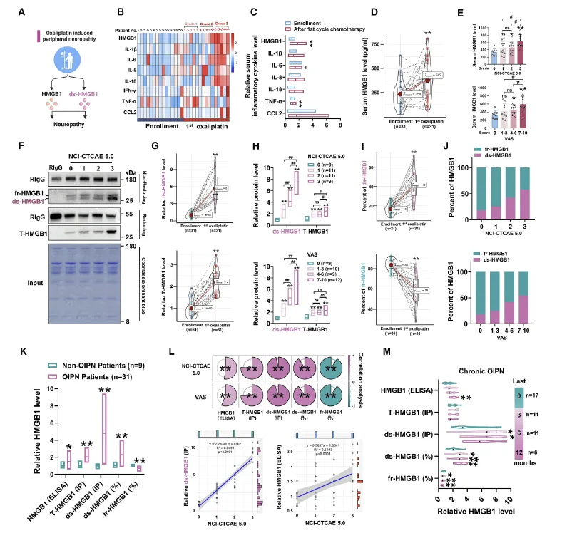 Figure 5:该图通过临床患者样本验证了血清 ds-HMGB1 与奥沙利铂诱导的周围神经病变(OIPN)疼痛严重程度及慢性化程度密切相关,明确其可作为 OIPN 的潜在生物标志物。研究收集了结直肠癌患者奥沙利铂化疗前后的血清样本,发现化疗后出现 OIPN 的患者血清 HMGB1 水平显著升高,且疼痛程度越严重(按 NCI-CTCAE 分级和 VAS 评分),血清 HMGB1 升高越明显。进一步检测发现,患者血清中升高的主要是 ds-HMGB1,其占总 HMGB1 的比例在 OIPN 患者中显著高于无神经病变的患者,且该比例与疼痛分级、VAS 评分呈强正相关。此外,在发生慢性 OIPN 的患者中,血清 ds-HMGB1 水平及占比与慢性神经痛的严重程度的相关性,远高于总 HMGB1,证实 ds-HMGB1 是比总 HMGB1 更优的、可用于评估 OIPN 疼痛严重程度和慢性化的临床生物标志物。