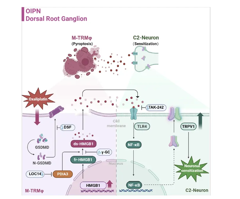 Figure 6:该图为该研究的核心机制示意图,系统性整合了 DRG 中 M-TRMφs 源性 ds-HMGB1 介导奥沙利铂诱导周围神经痛的完整分子通路,直观呈现了 “巨噬细胞 - 神经元” 的神经免疫交互调控轴。奥沙利铂作用于 DRG 后,诱导 M-TRMφs 中 PDIA3 上调,PDIA3 催化胞内 HMGB1 氧化形成二硫键,生成具有促炎活性的 ds-HMGB1;同时奥沙利铂触发 M-TRMφs 发生 GSDMD 介导的焦亡,使胞内的 ds-HMGB1 大量释放至胞外;释放的 ds-HMGB1 特异性结合邻近 C2 亚型感觉神经元表面的 TLR4,激活神经元内的 NF-κB 信号通路,进而上调痛觉相关离子通道 TRPV1 的表达,增强 C2 神经元的伤害性感受兴奋性,最终引发并放大机械痛敏化,形成 OIPN 的核心病理环路。同时示意图也标注了该通路中的关键干预靶点,包括 PDIA3 抑制剂 LOC14、GSDMD 抑制剂 DSF、TLR4 抑制剂 TAK-242 及 γ-GC 等,为 OIPN 的临床干预提供了明确的分子靶点方向。