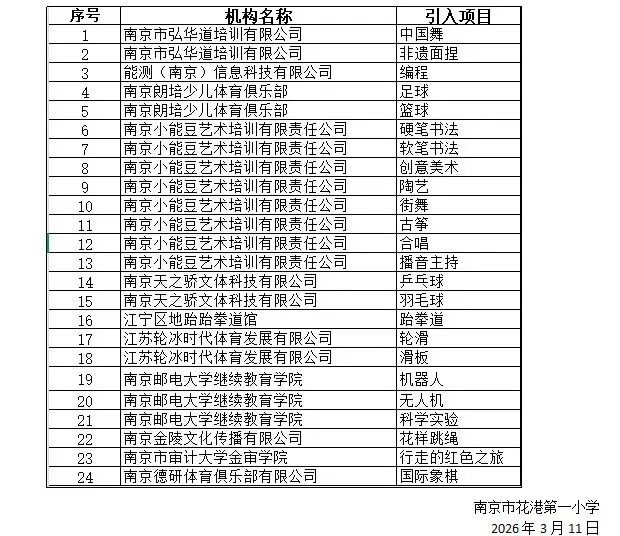 为进一步丰富我校课后服务内容,满足学生多元发展需求,根据栖霞区《关于规范引导第三方机构参与中小学课后服务的实施办法》相关要求,经机构自主申报、学校资格初审、遴选小组现场评审,现将2026年春季学期参与学校课后服务的第三方机构及引入项目公布如下: