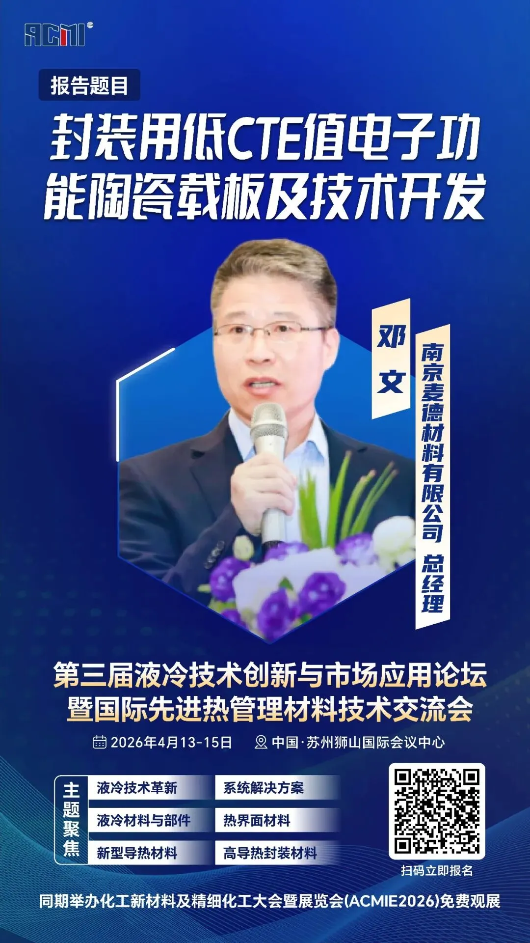 1990年毕业于南昌航空工业学院金属腐蚀与防护专业,1996年硕士毕业于天津大学研究生院应用化学专业,先后在湘潭工学院(现湖南科技大学),美国杜邦公司,德国LPKF公司和比亚迪公司工作,历任讲师,项目经理,经理,厂长,总监等职。2012年创立三维立体线路公司,并完成科技部和财政部“中小型企业创新基金”支持。2019年8月创立南京麦德材料有限公司,任执行董事、总经理。演讲题目:《封装用低CTE值电子功能陶瓷载板及技术开发》