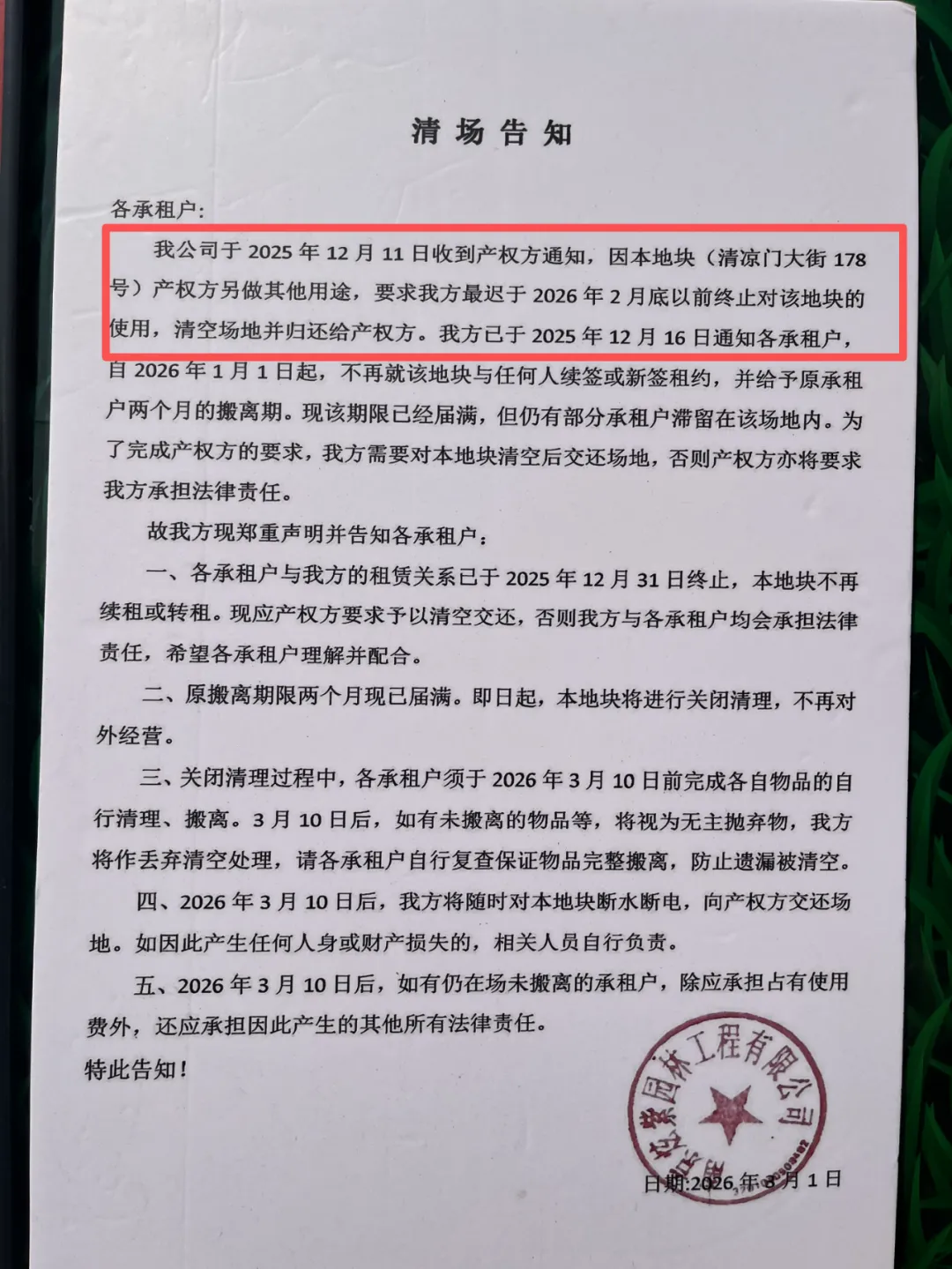 去年年底,市场门口贴出公告:因清凉门大街178号地块即将做其他用途,对该场地终止使用并交回,租赁商户合同到期后不续签。