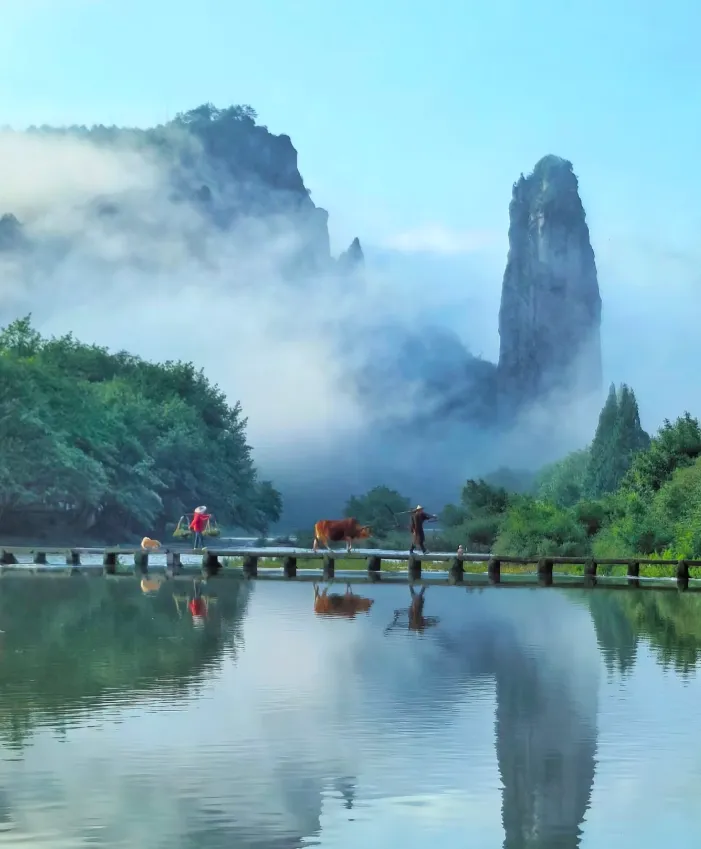 • 朱潭山邂逅老翁牵牛缓缓行过石桥,鼎湖峰倒影如墨铺展。