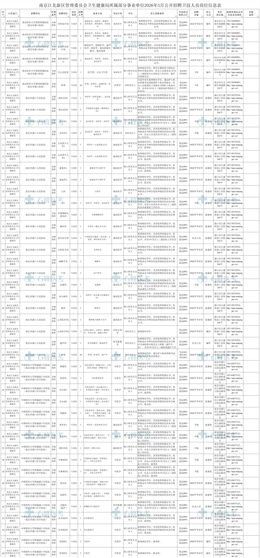 本次招聘相关信息在南京江北新区管理委员会网上发布。具体的招聘岗位、数量、资格条件等详见《南京江北新区管理委员会卫生健康局所属部分事业单位2026年3月公开招聘卫技人员岗位信息表》(以下简称《岗位信息表》)。