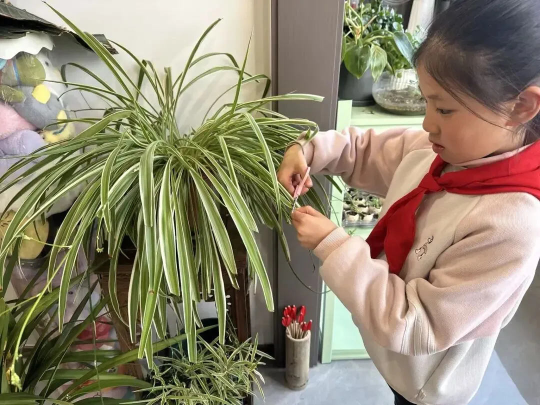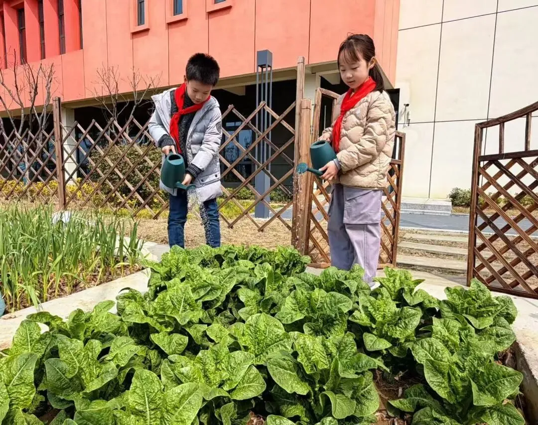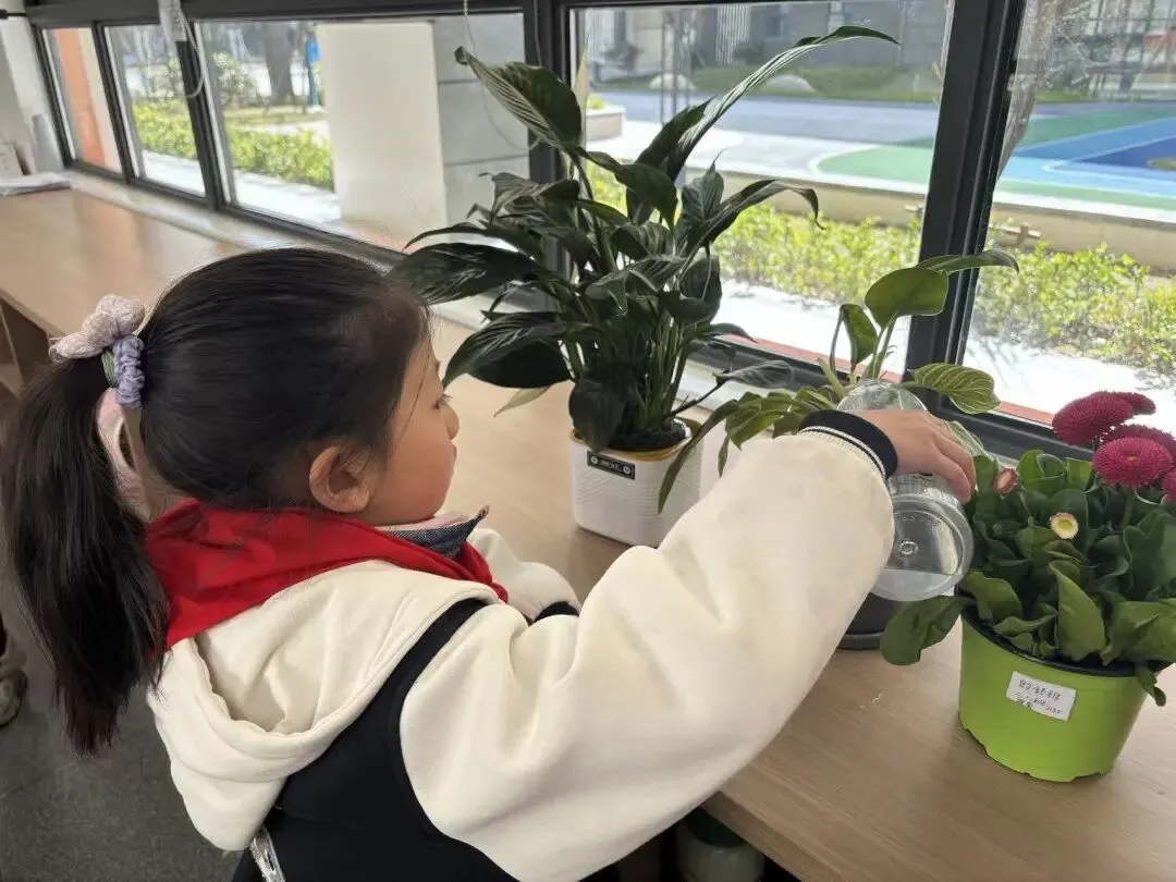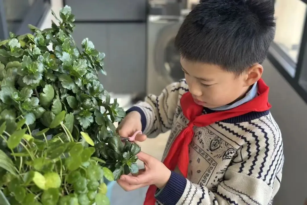二年级同学化身小园丁,整理“融耕小筑”小菜园,清除杂草、规整土地;同时细心照料教室绿植,浇水擦拭,在劳动中学会责任与担当。