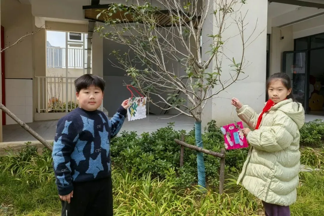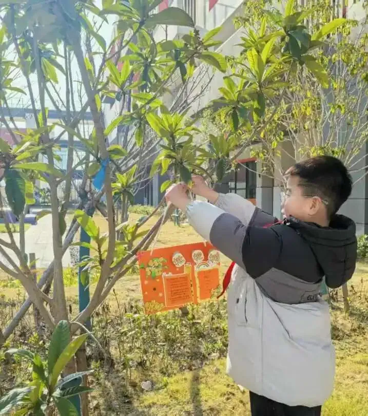 三年级同学化身校园绿色守护者,为树木精心设计并制作专属树牌,写上名称与守护标语,给每一棵树挂上独一无二的“身份证”。