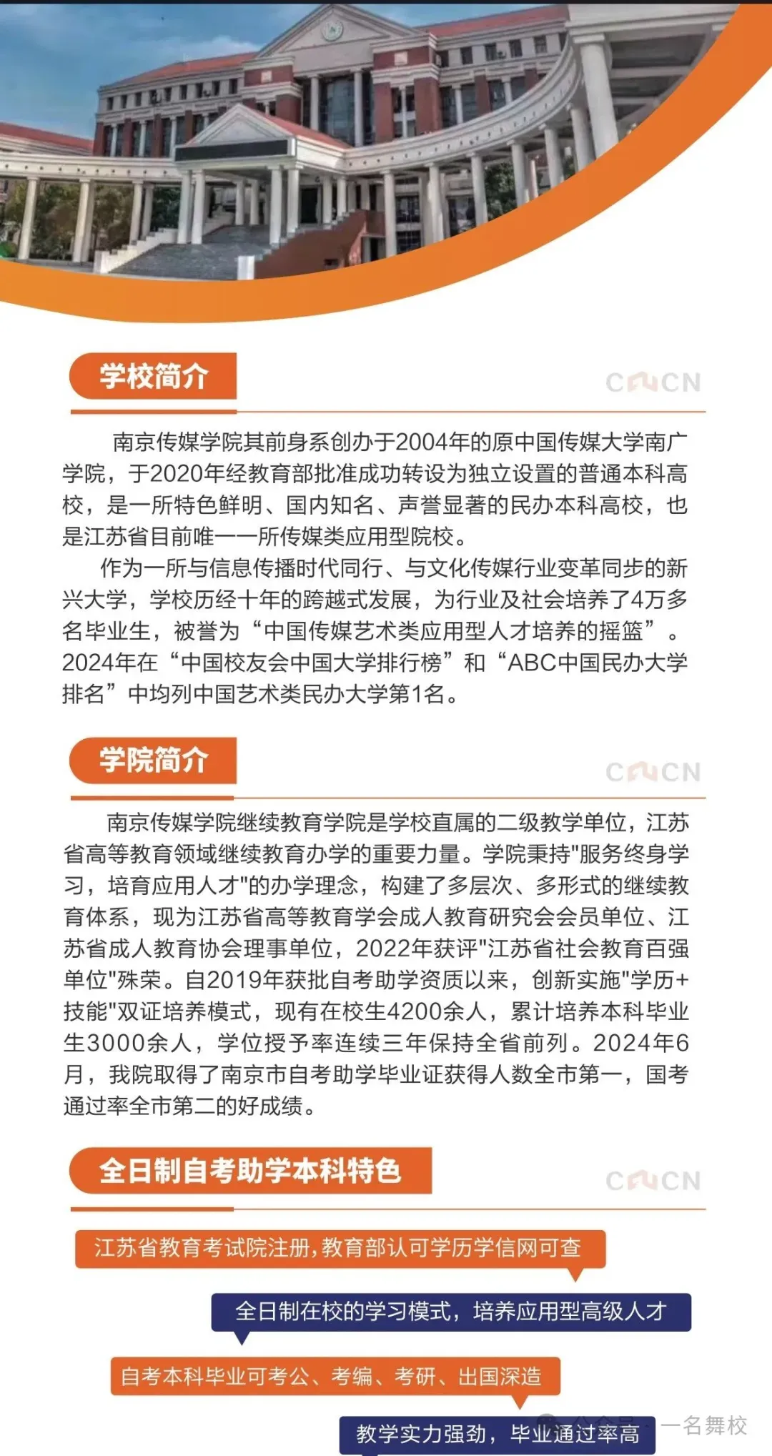 6)荣誉众多,成果显著:南京传媒学院专接本、高起本历届学员,在学校安排推动下,参与各种传媒类技能大赛,并获多优秀成绩和奖项,为企业提供诸多优秀传媒人才并在各岗位担任重要职务,历年来受到学生和家长的一致好评。