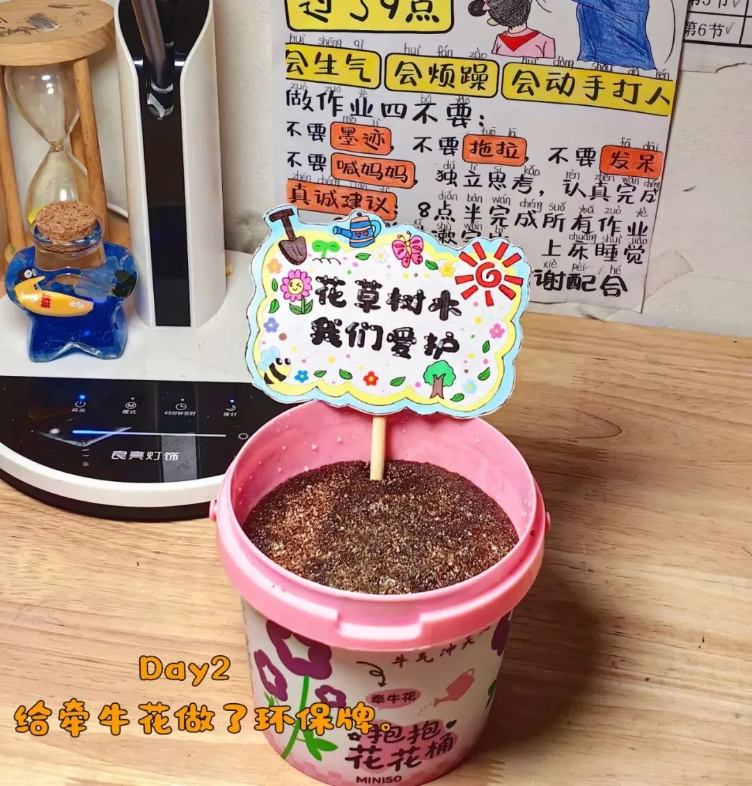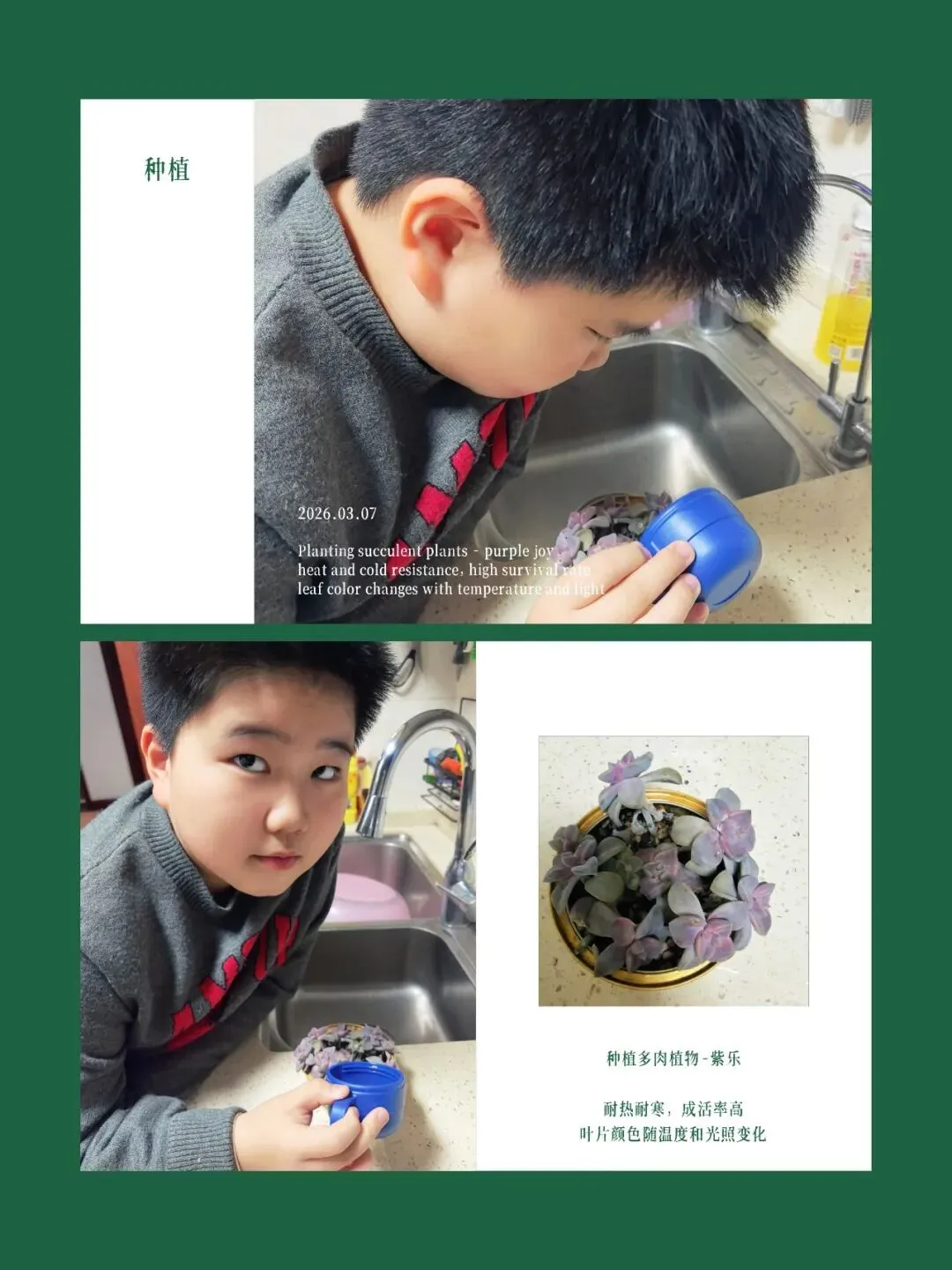一盆盆绿植、一棵棵小树苗在家庭中扎根生长!填土、扶苗、浇水,每一个步骤都凝聚着爱与期待。孩子们在劳动中体验到耕耘的乐趣,深刻领悟“一分耕耘,一分收获”的道理,这一株株充满生机的绿植,也成为了家庭环保理念的鲜活象征。